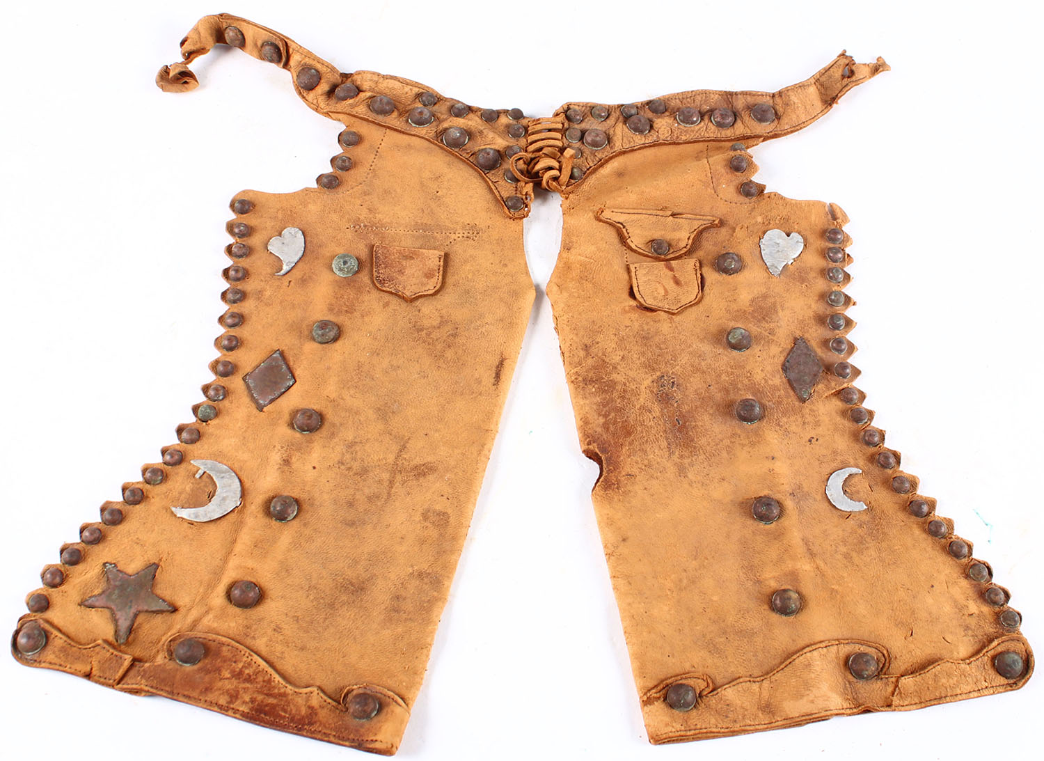 RARE! Baby leather cowboy chaps fully Studded with cut out metal moon, hearts, diamond and star, Early chaps about 1890, most likely made at the ranch. Grade: Very Good ++ - Value: 50 to 300