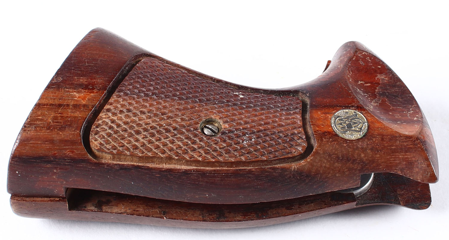 S&W Revolver Checkered wood Grips, has screw. Grade: Excellent - Value: 30 to 90