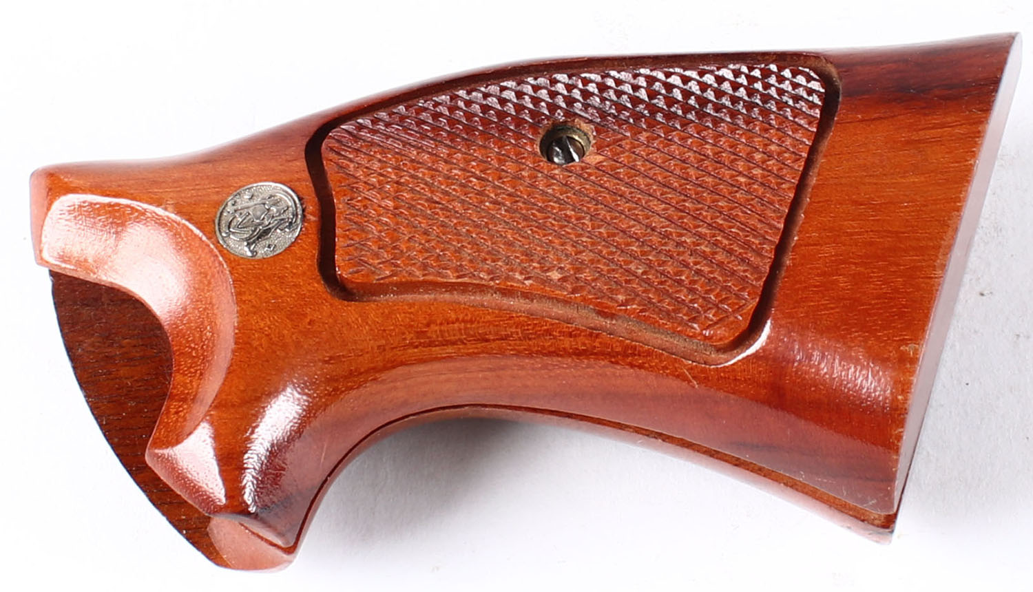 S&W Revolver Checkered wood Grips, has screw. Grade: Excellent - Value: 30 to 90
