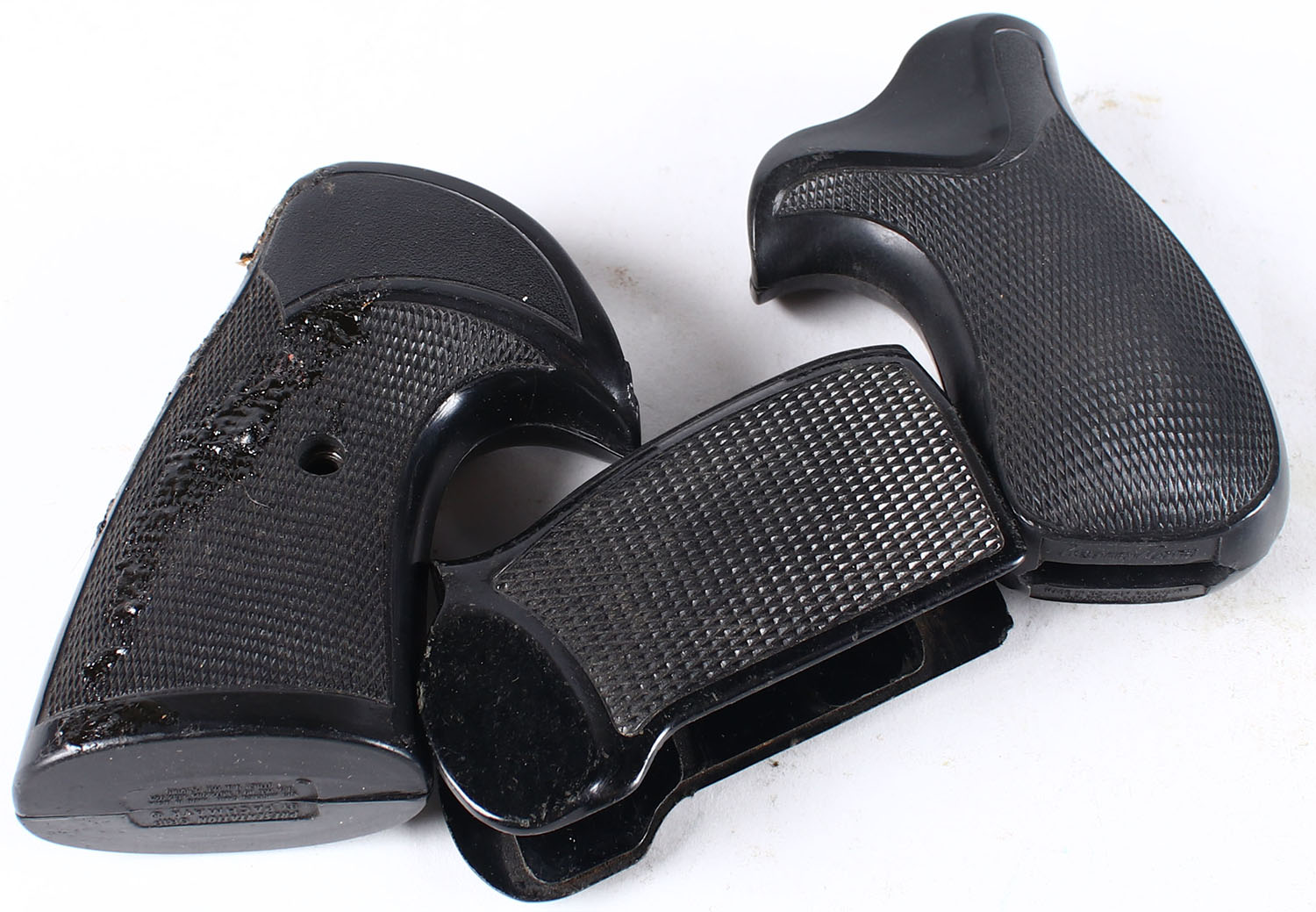 Lot of 3 pistol grips, 2 rubber Pachmayr Grips and 1 unmarked plastic grip. Grade: Excellent - Value: 10 to 50