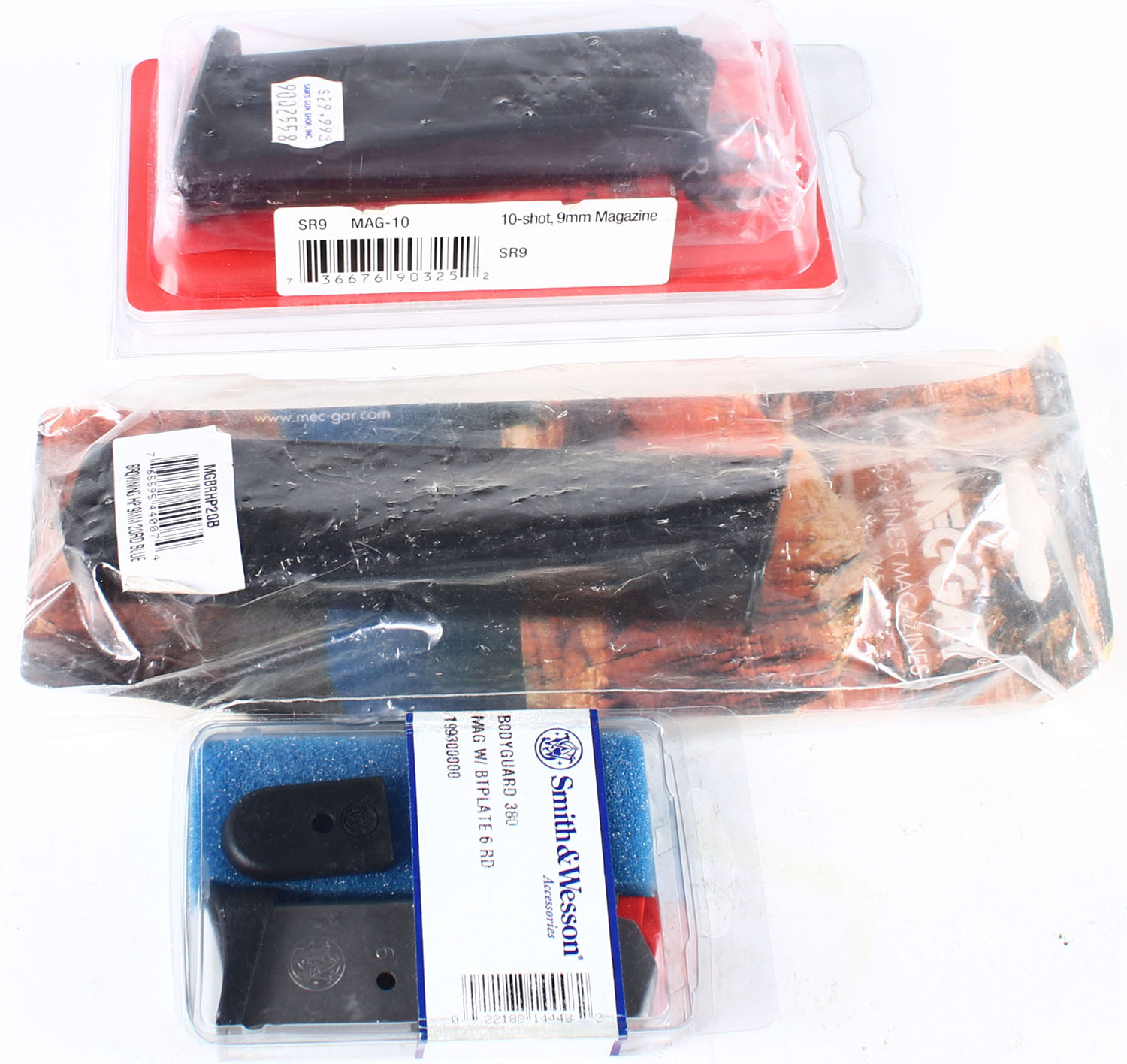 Lot of 3 pistol mags, Ruger 9mm 10 rd, S&W .380 6 rd and Meggar Browning HP 9mm 20 rd . Grade: Excellent - Value: 20 to 60