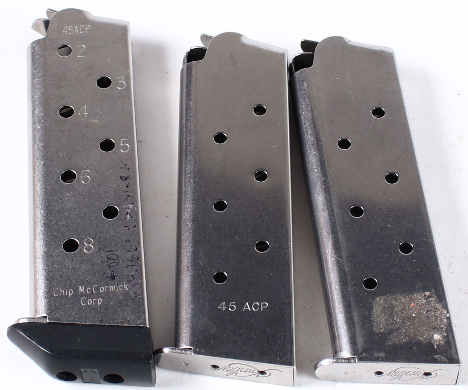 Lot of 3 pistol magazines, 45 cal Kimber and Chip Mccormick Corp. Grade: Excellent - Value: 30 to 90
