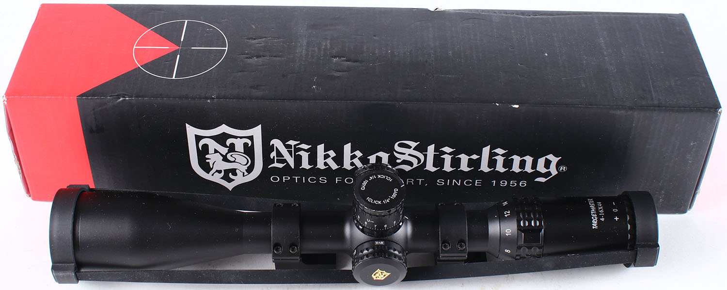 Nikko Stirling TargetMaster 1'' rifle scope, 4-16x44 half mil dot, in original box. Grade: Excellent ++ - Value: 150 to 300