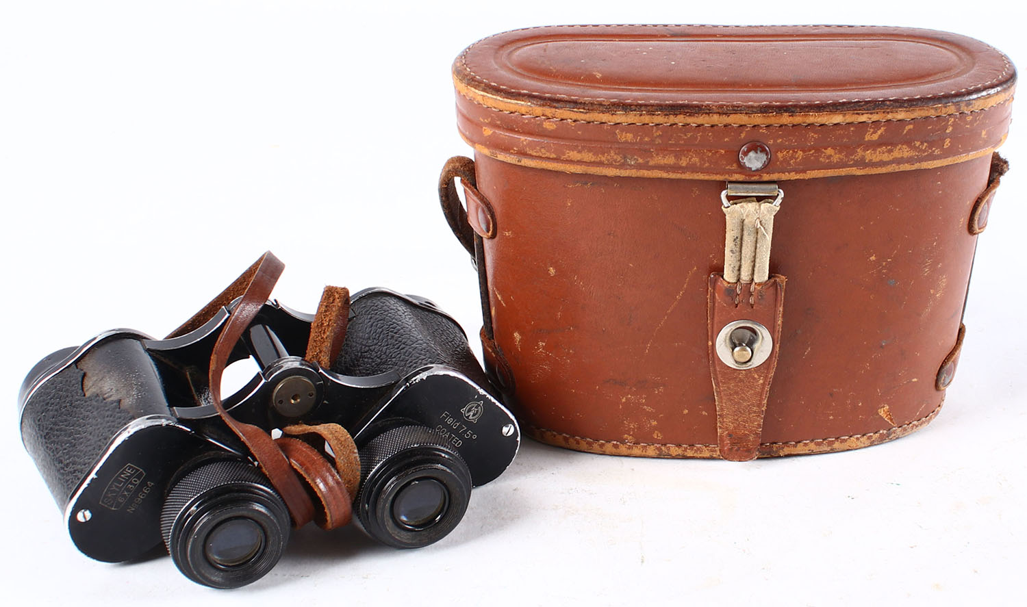 Skyline 6x30 No 9664 binoculars, in original leather case, Field 7.5 degree, has leather strap. Grade: Excellent - Value: 16 to 50