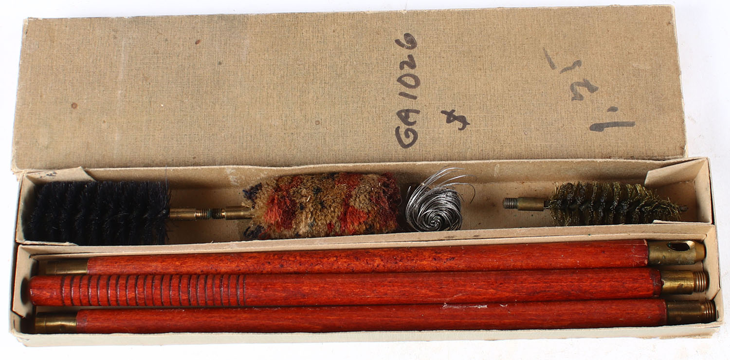 Unmarked gun cleaning rod and brushes, large brushes maybe 10 ga. Grade: Excellent - Value: 6 to 40