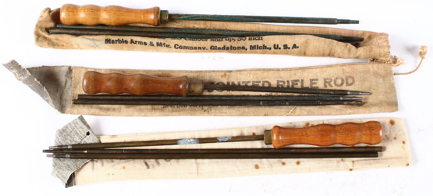 Lot of 3 Marbles jointed rifle cleaning rods, NO 9622 .22 cal/.25 cal(2) and (1) NO 9728 .28 cal and up. Grade: Excellent - Value: 20 to 60