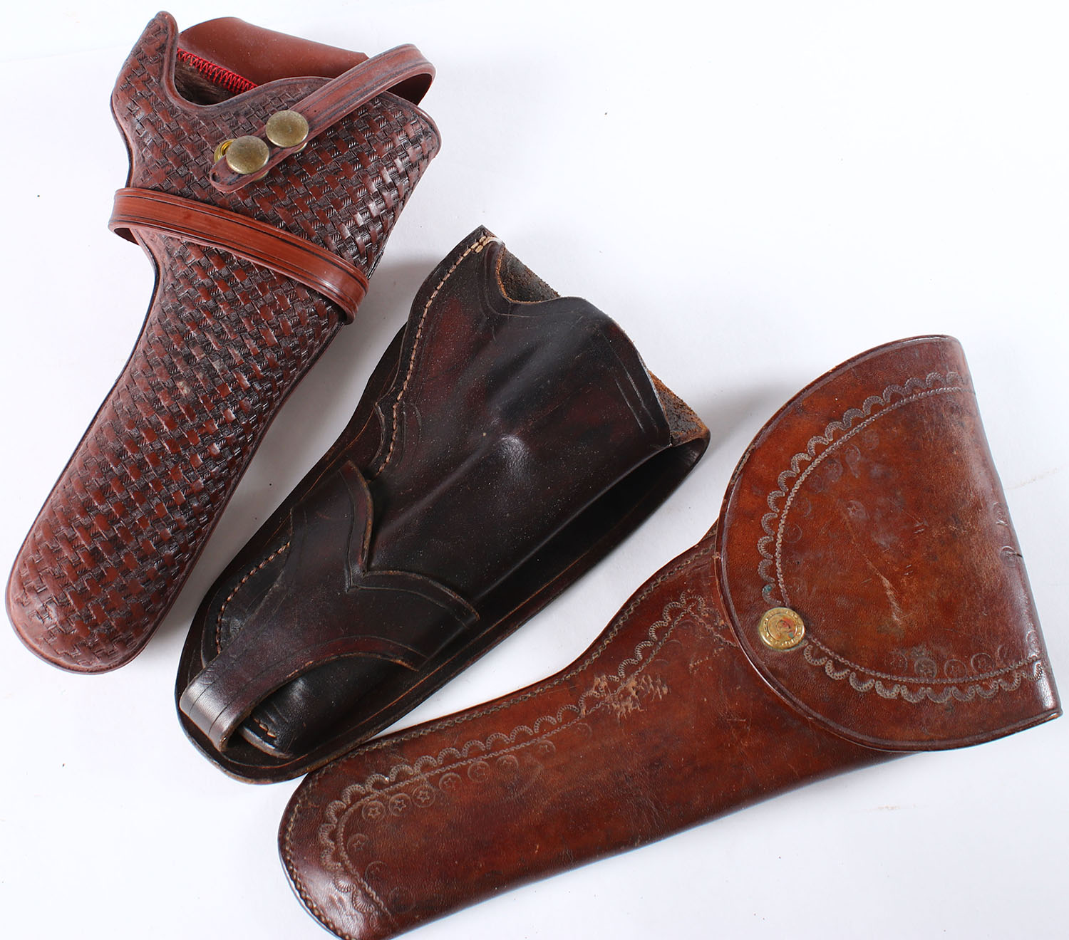 Lot of 3 leather pistol holsters, Geo. Lawrence, Pistol packer and unmarked. Grade: Excellent - Value: 20 to 60