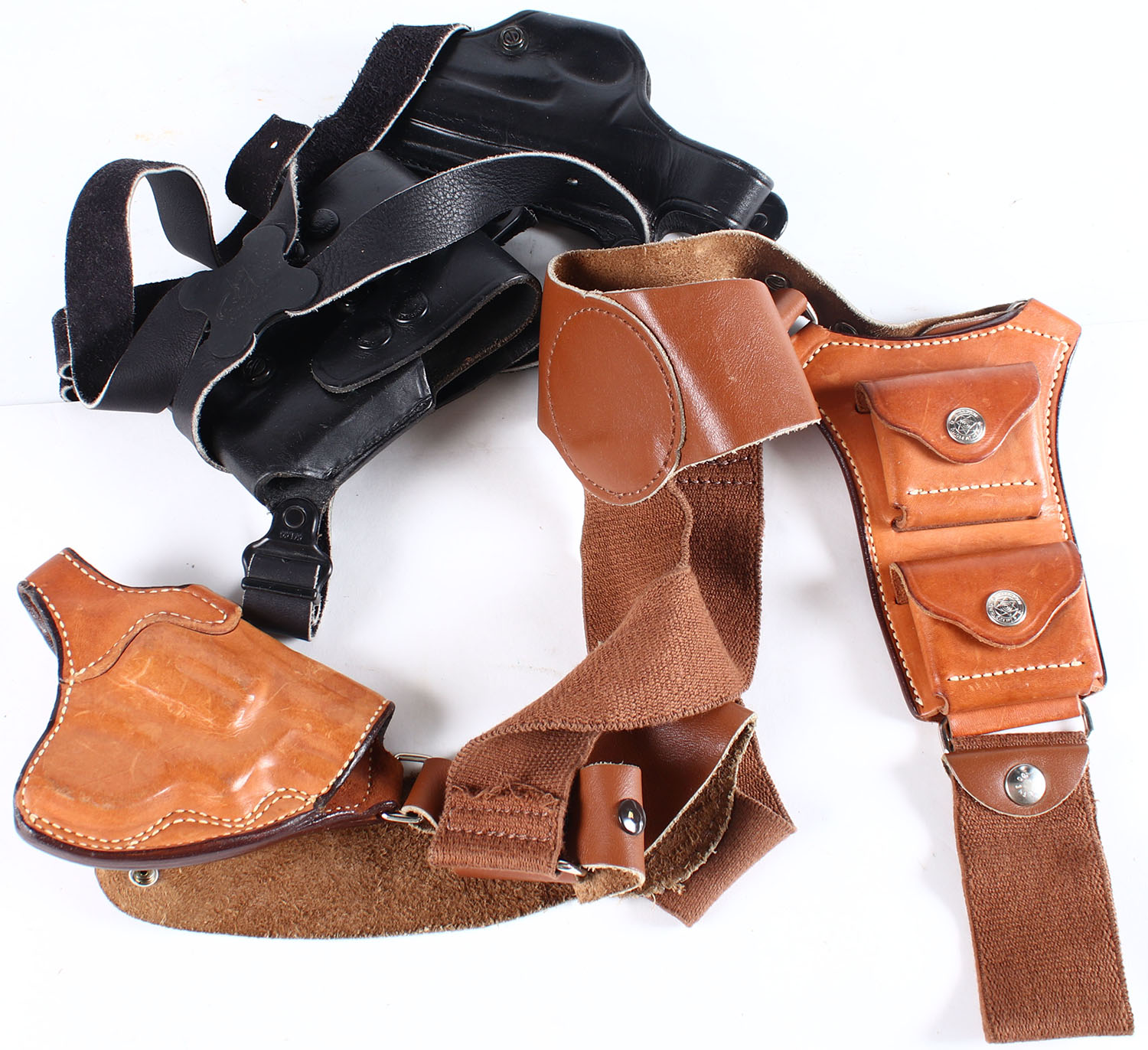 Large lot of leather pistol holsters. Grade: Excellent - Value: 20 to 80