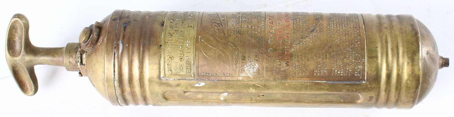 Antique brass fire extinguisher, Pyrene No 799598, solid with a dent and age soiling. Grade: Very Good ++ - Value: 10 to 40