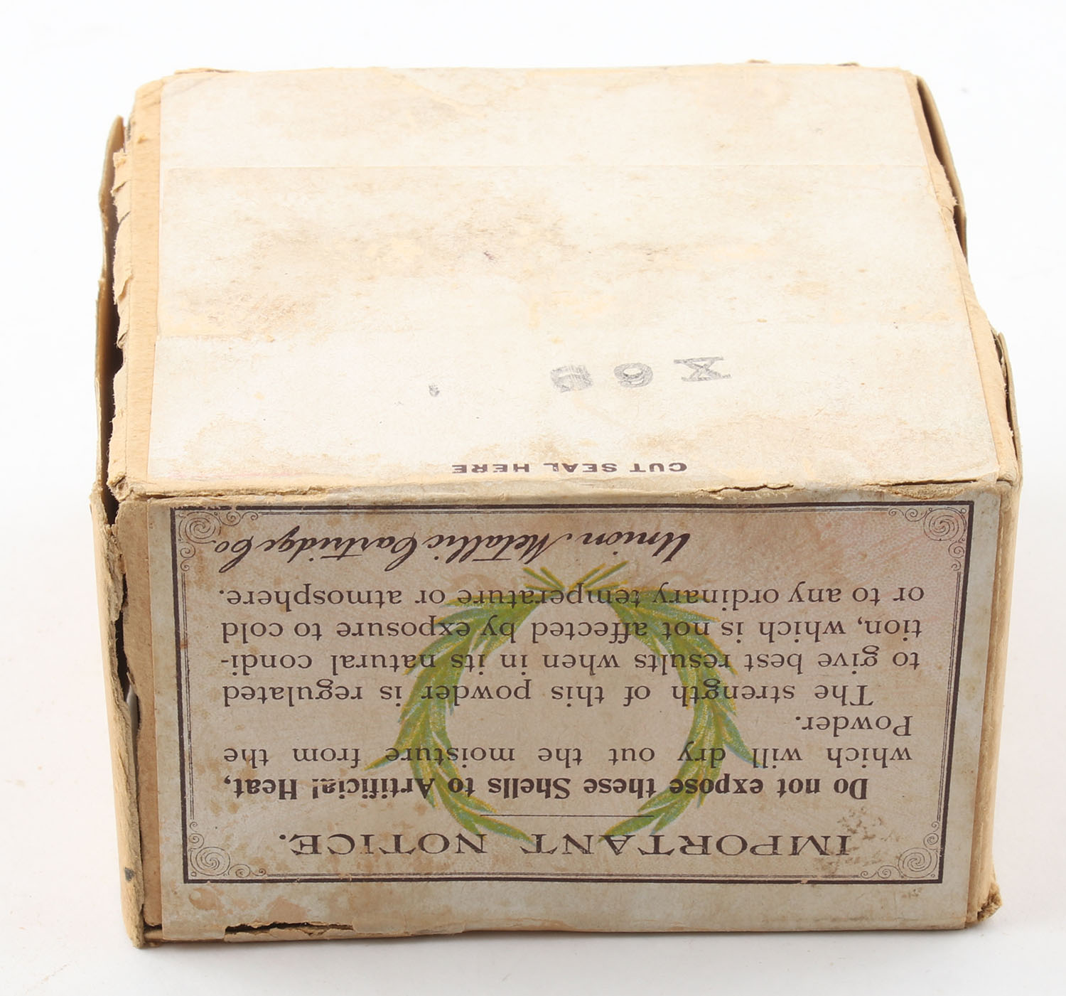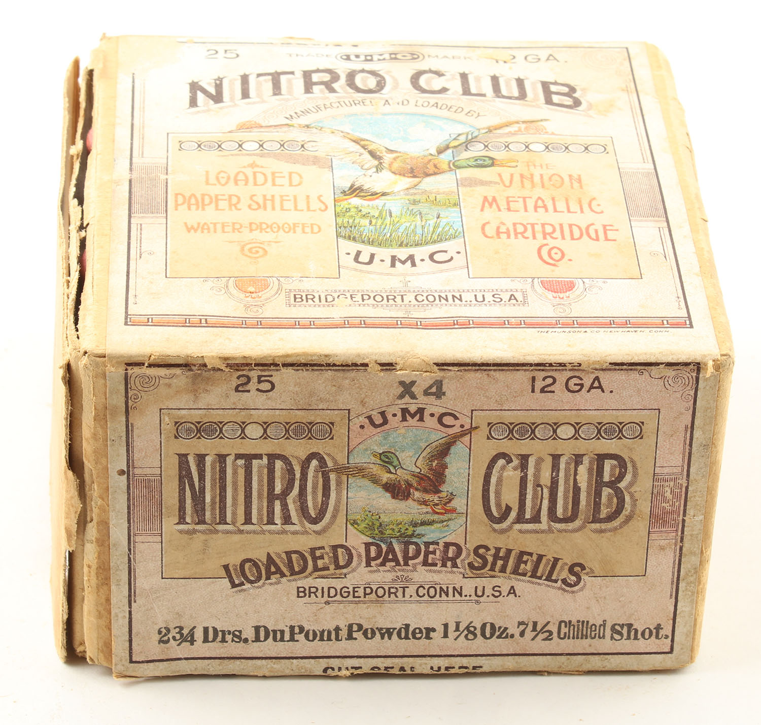 RARE!!! UMC, Nitro Club, 12ga., 2pc., FULL & HALF SEALED, Shot size 7 1/2CH., buff box with multi-colored label that pictures duck flying out of marsh grass, box has seam splits to top, bottom & left side, box has light shelf wear with edge wear, paper shells appear excellent. Grade: Very Good ++ - Value: 1000 to 3000