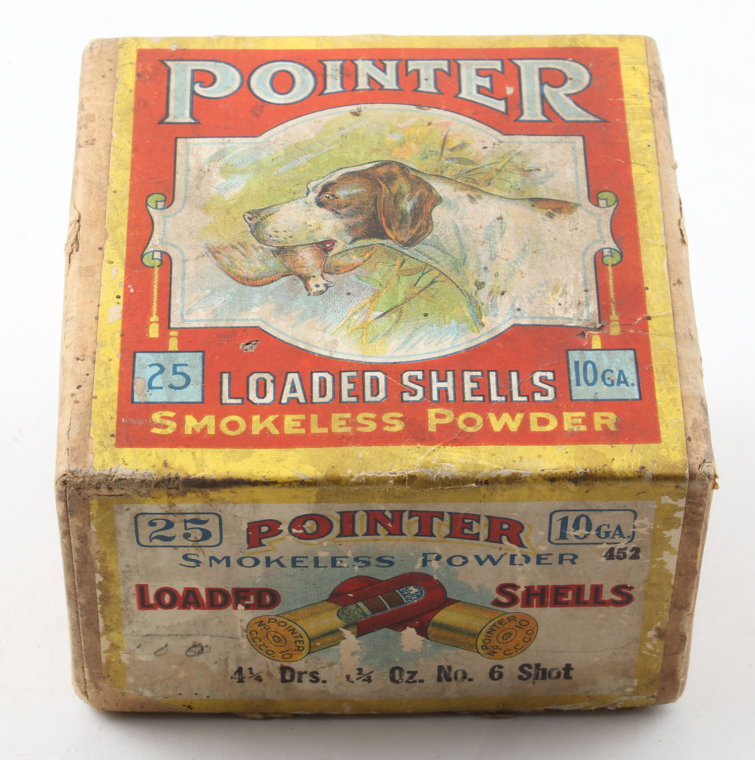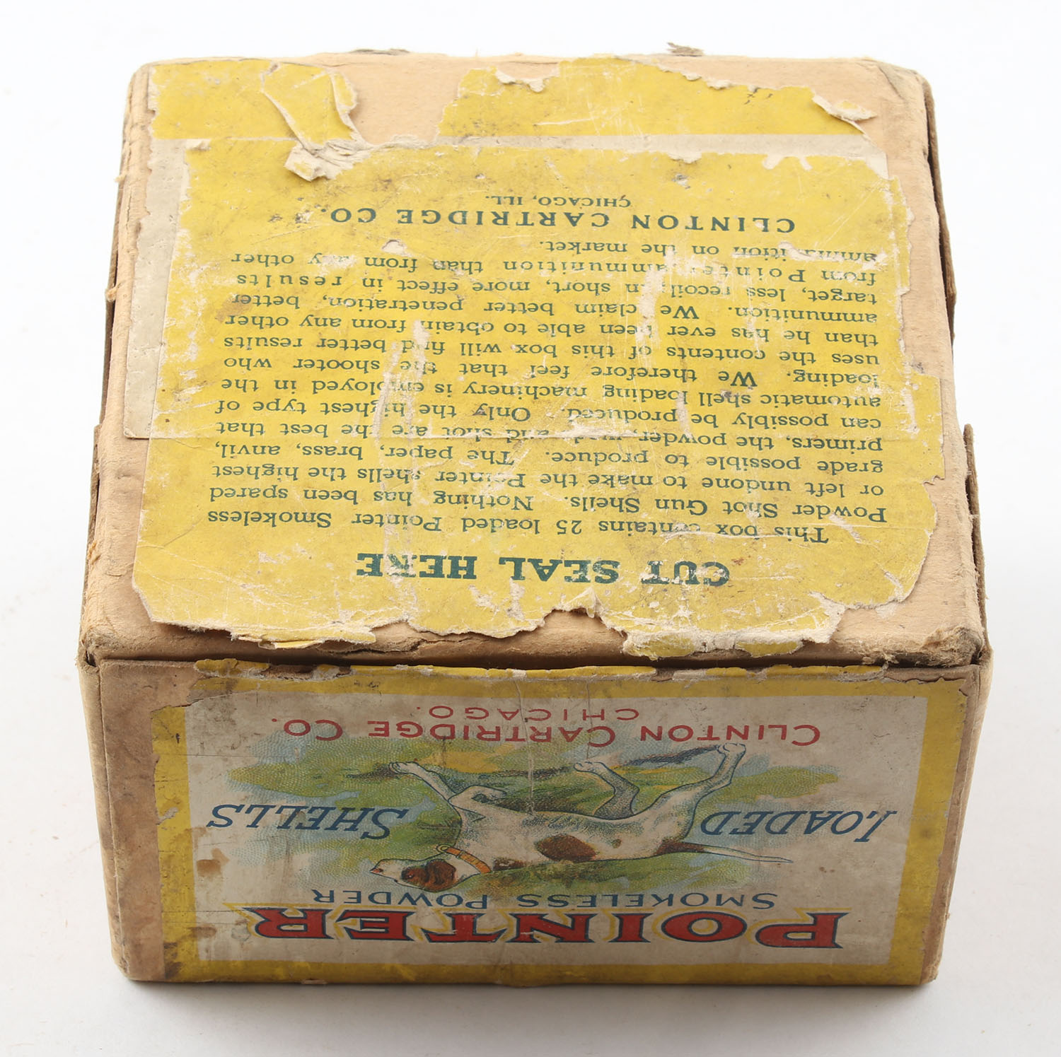 CLINTON Cartridge Co., POINTER, 10ga., 2pc., Partial 24rds. With 15rds being correct, shot size 6, buff box with multi-colored label of a dog holding a quail, sides picture crossed shells & a dog on point, box has age soiling with edge & corner wear, label is intact with great colors, paper shells are very good. Grade: Very Good ++ - Value: 400 to 800