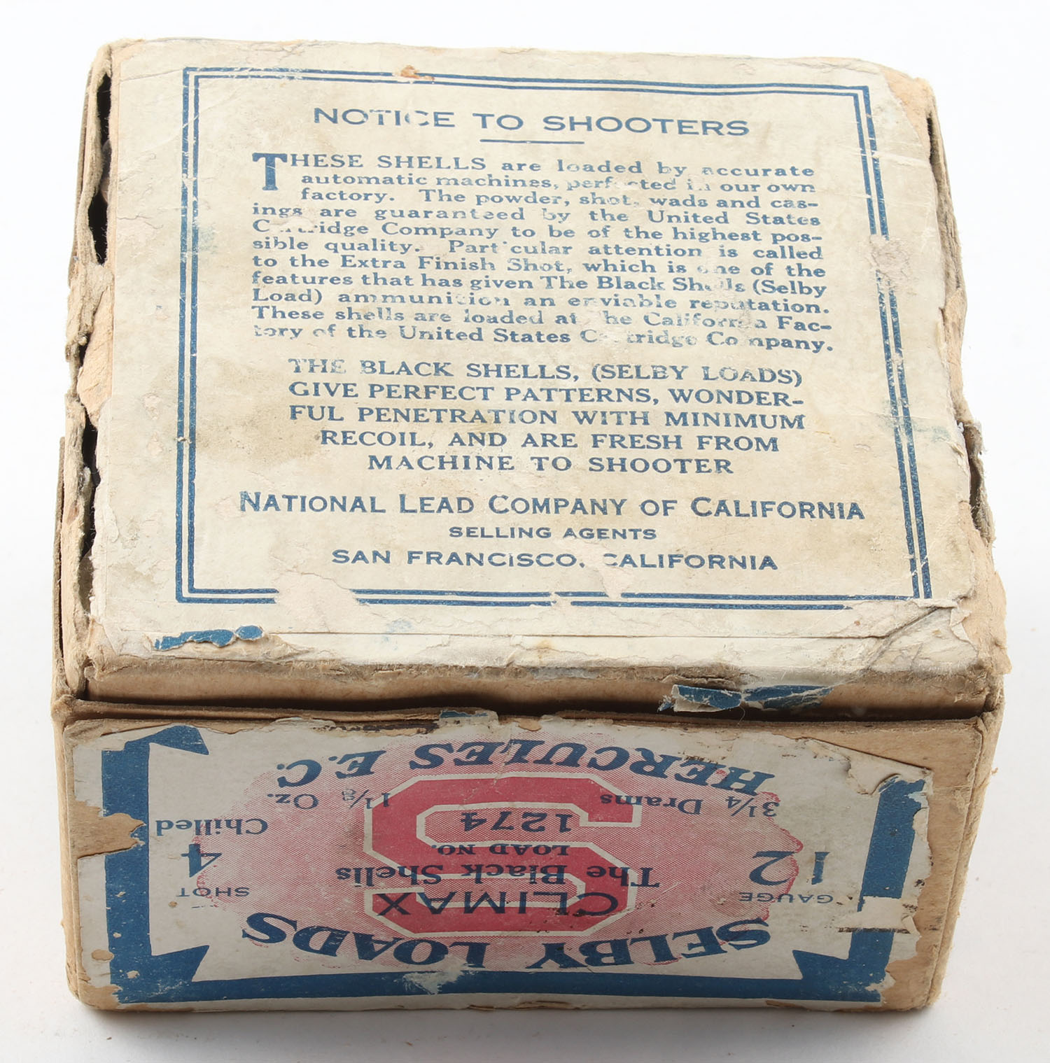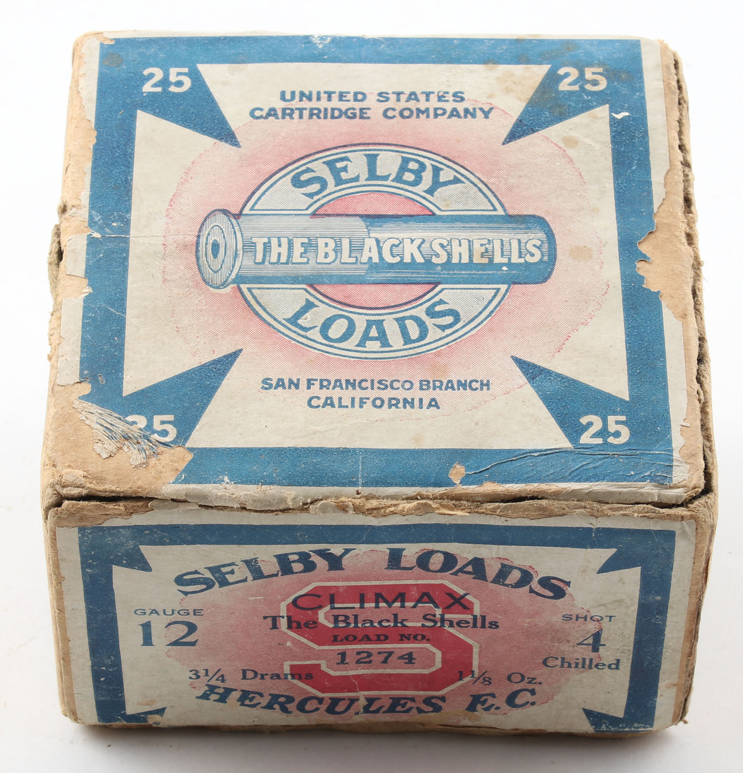 SELBY, United States Cartridge Co., Selby The Black Shells Loads, CLIMAX Shells, 12ga., 2pc., Partial 17rds., shot size 4CH, buff box with blue, red & white paper label, box has seam splits to top & bottom, has age soiling with edge & corner wear, paper shells are excellent. Grade: Good ++ - Value: 50 to 200