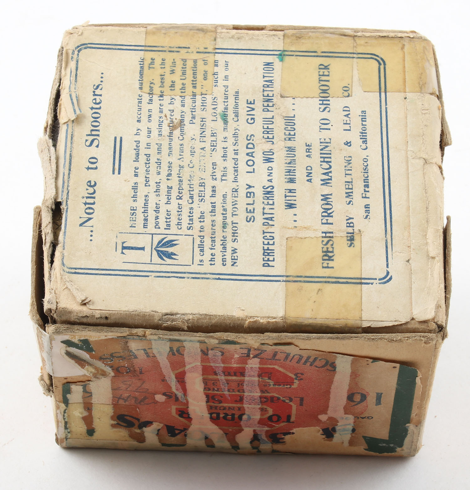 SELBY, Selby Smelting & Lead Co., Selby Shot Gun Loads, Leader Shells, Schultze Smokeless, 16ga, 2pc., Partial 15rds, 5 being correct shot, shot size 6 Chilled Shot, buff box with green, red & blue paper label, box has a seam split with tape repairs, soiling, edge wear & scuffing. Grade: Good + - Value: 70 to 250