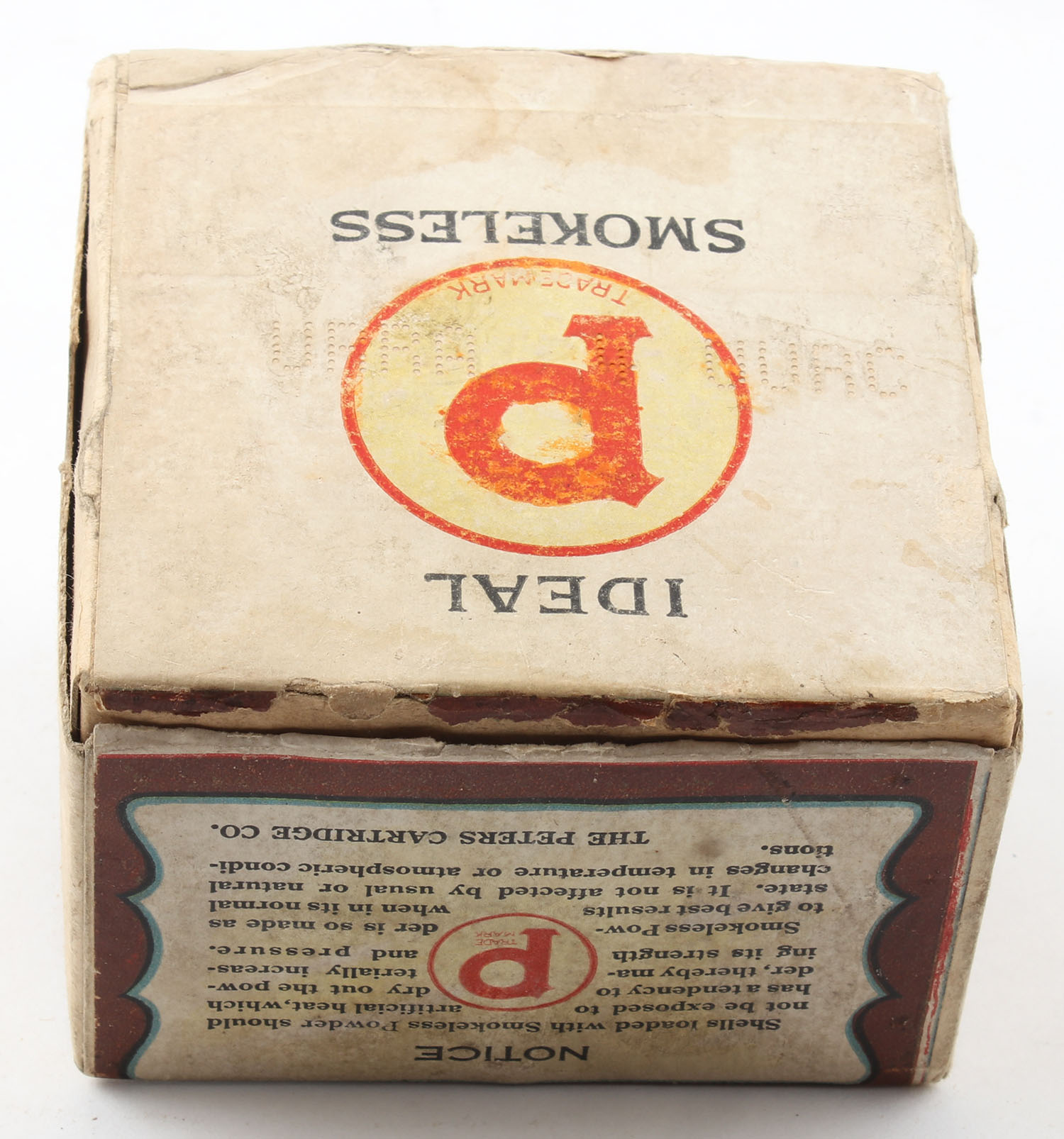 Peters Cart. Co., IDEAL, Blue Wing Teal, 12ga., 2pc., Full of fired shells, shot size 7 1/2CH., buff box with multi-colored label that pictures Blue Wing Teal in flight, box has some age soiling with edge & corner wear, bottom has a seam split due to shell protrusion, fired shells are fair. Grade: Very Good ++ - Value: 500 to 1200