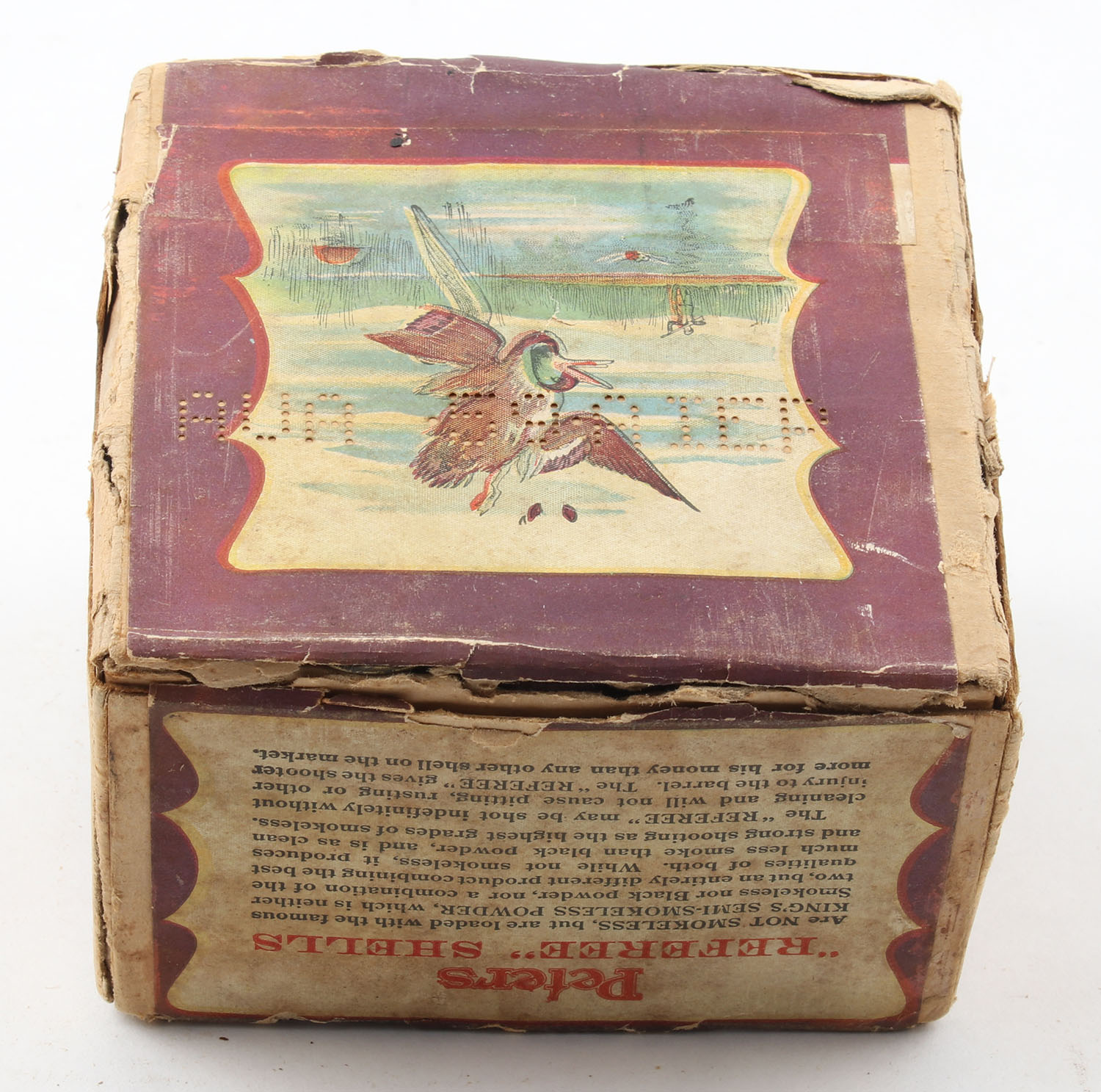 Peters Cart. Co., Referee, 12ga., Full, Loading: No. A94, 3 Drs., 1 Oz., No. 4 shot, buff box with multi-colored label with flying ducks, box has age soiling with edge wear, top has tape repairs to seam splits, bottom has shell protrusion, paper shells are very good to excellent. Grade: Very Good - Value: 400 to 1000