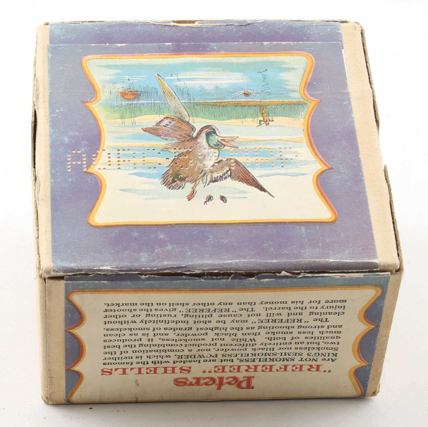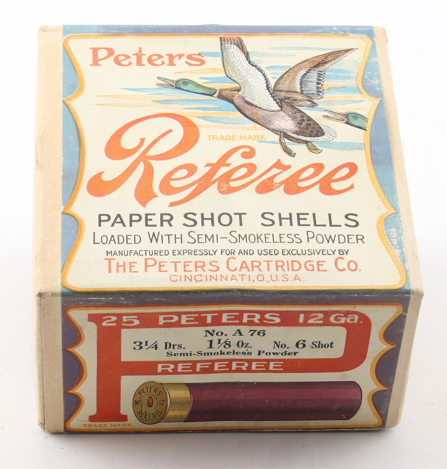 Peters Cart., Referee, 12ga., 2pc., Empty, Loading: No. A 76, 3 1/4 Drs., 1 1/8 Oz., No. 6 shot, buff box with multi-colored label with flying ducks, box is very solid with excellent color, box has very minor edge wear. Grade: Excellent + - Value: 400 to 900