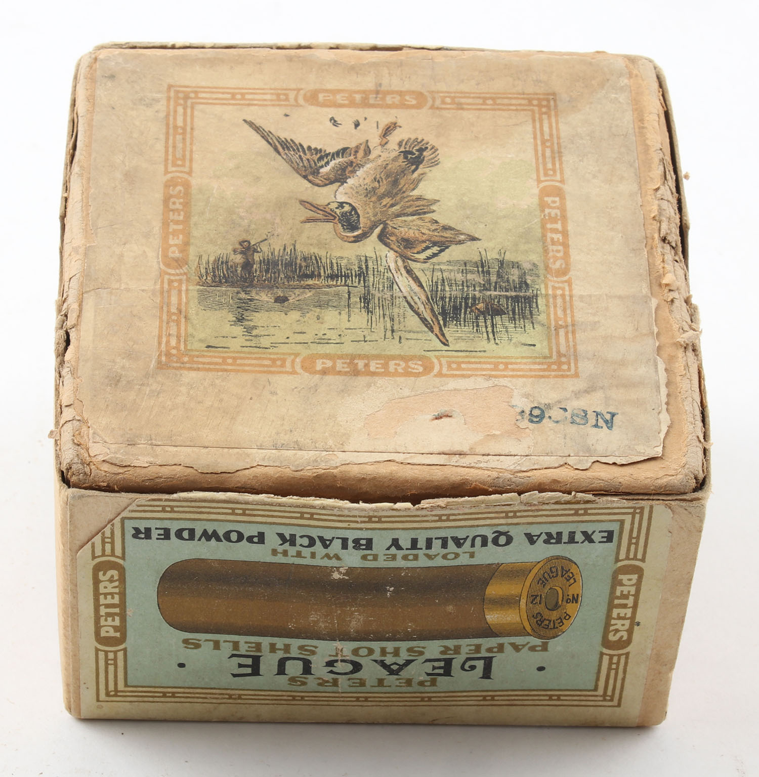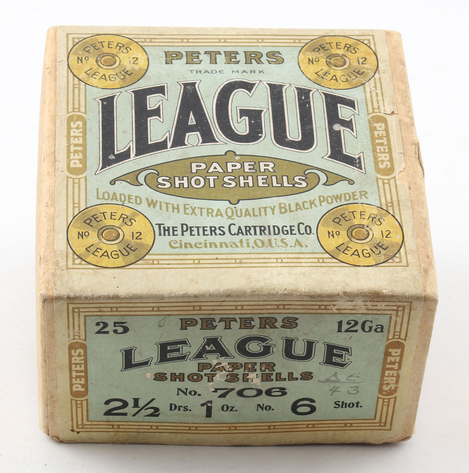 Peters Cart. Co., LEAGUE, 12ga., 2pc., Empty, shot size 6, buff box with light green, blue & yellow & four gold shotshell heads in each corner, Loading: No. 706, 2 1/2 Drs., 1 oz., No. 6 shot, box has light age soiling & edge wear to bottom, box has good to very good color. Grade: Very Good + - Value: 500 to 1000