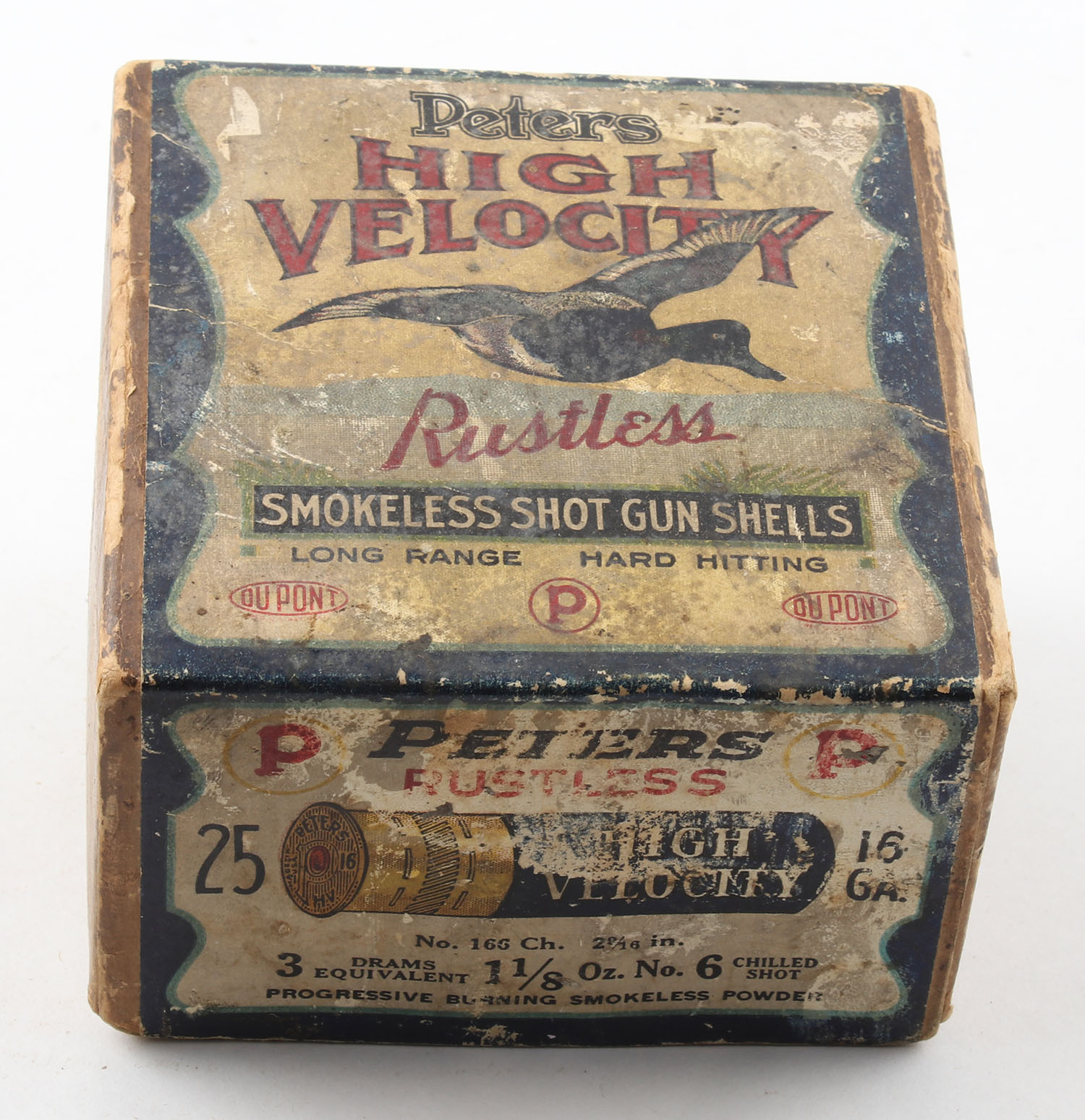 Peters Cart. Co., Blue Bill, 16ga., 2pc., Empty, shot size 6ch shot, buff box with multi colored label that pictures Blue Bill in flight, box is solid with age soiling, edge wear & scuffing. Grade: Good + - Value: 50 to 100