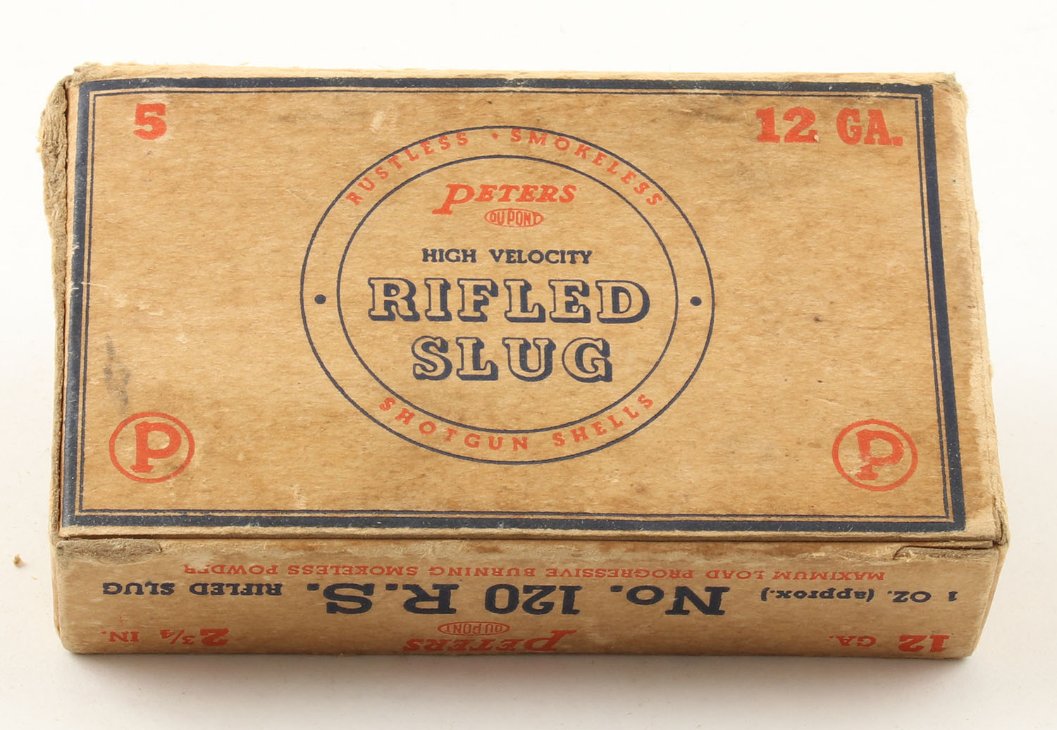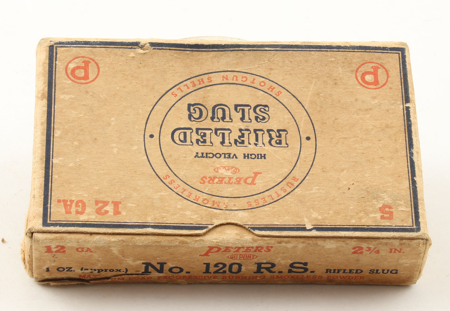 Peters Cart. Div., 12ga., 2 3/4'', 1pc., Full, shot size Rifled Slug, blue, orange & buff colored box, box is solid with very nice colors, paper shells are excellent. Grade: Very Good ++ - Value: 10 to 30