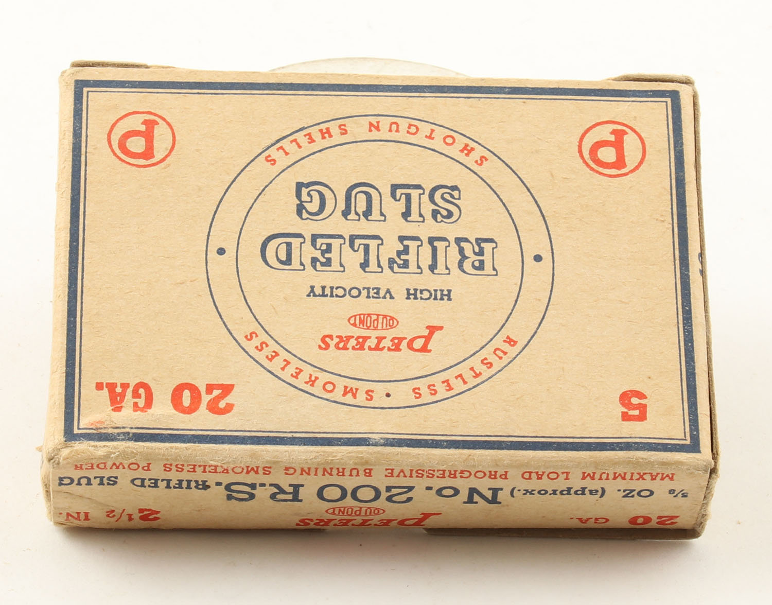 Peters Cart. Div., 20ga., 2 1/2'', 1pc., Full, shot size Rifled Slug, blue, orange & buff colored box, box is solid with very nice colors, paper shells are excellent. Grade: Very Good ++ - Value: 10 to 30