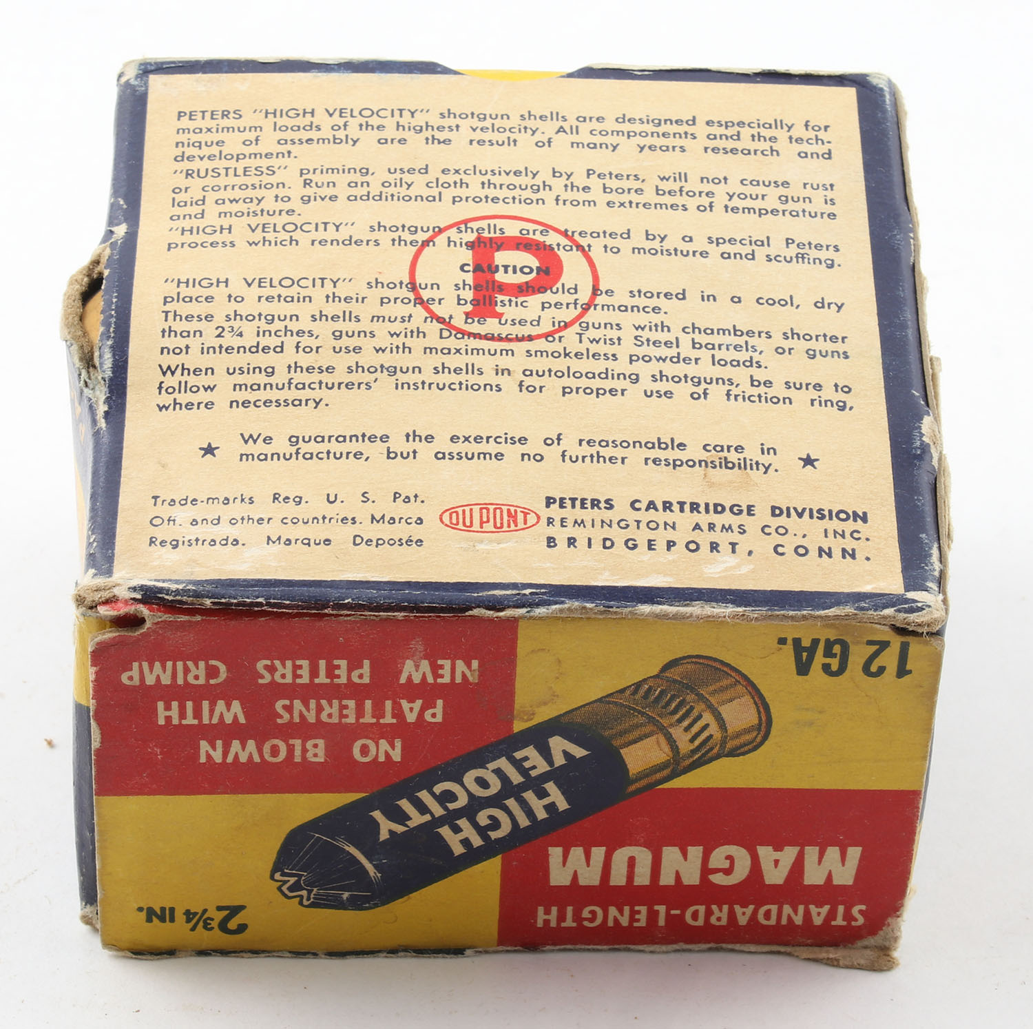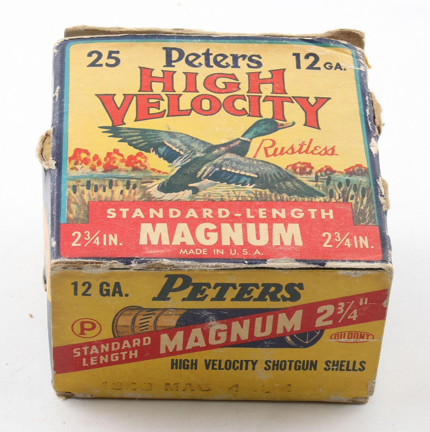 Peters Cart. Co., High Velocity, New Peters Crimp, 12ga., 1pc., Full, 2 3/4'', shot size 4 Magnum, multi colored box that pictures mallard flying out of the marsh grass, box has shell protrusion with edge & corner wear, has a seam split to top flap, paper shells are very good. Grade: Good ++ - Value: 20 to 60