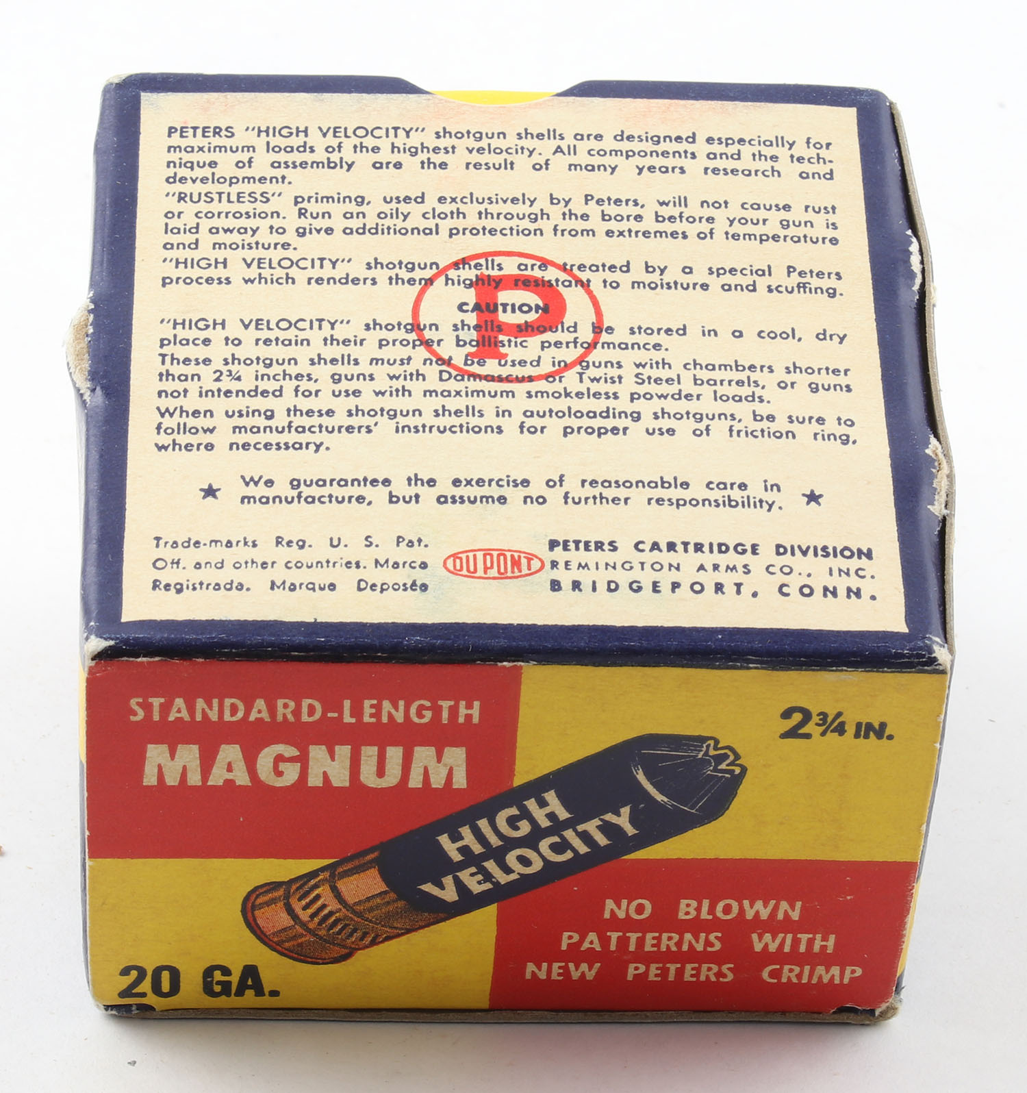 Peters Cart. Div., High Velocity, Standard length Magnum, 20ga., 1pc., Full, shot size 7 1/2, multi colored box that pictures mallard flying out of the marsh grass, box has shell protrusions with light edge wear, box has excellent color, paper shells are excellent. Grade: Excellent - Value: 50 to 150