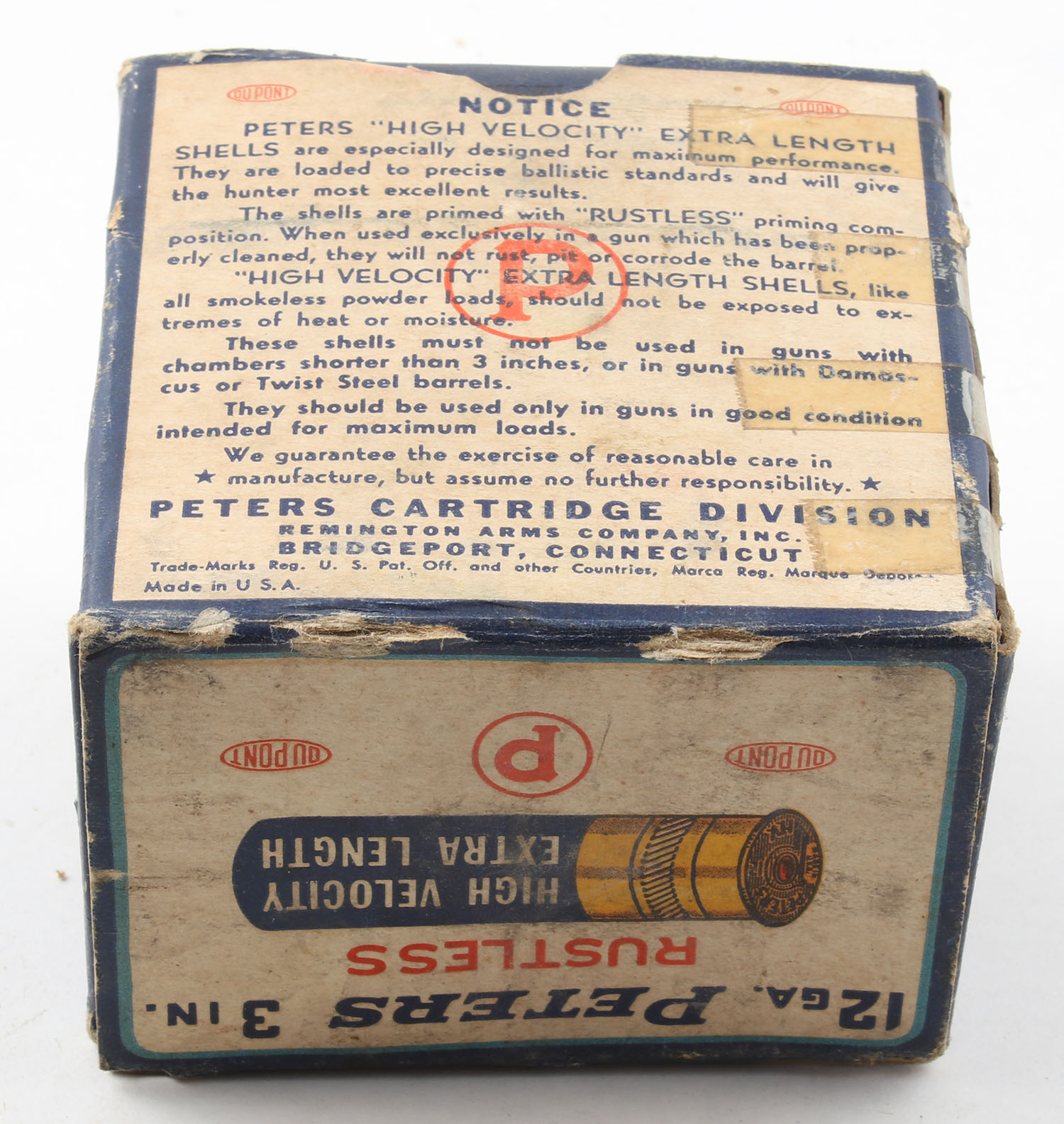 Peters Cart. Co., Bridgeport, CT, High Velocity, Extra Length 12ga., 3'' Magnum, 1pc., Partial 23rds, shot size 6, multi colored box that pictures mallard flying out of the marsh grass, box has age soiling with light scuffing, paper shells are excellent. Grade: Very Good - Value: 20 to 80