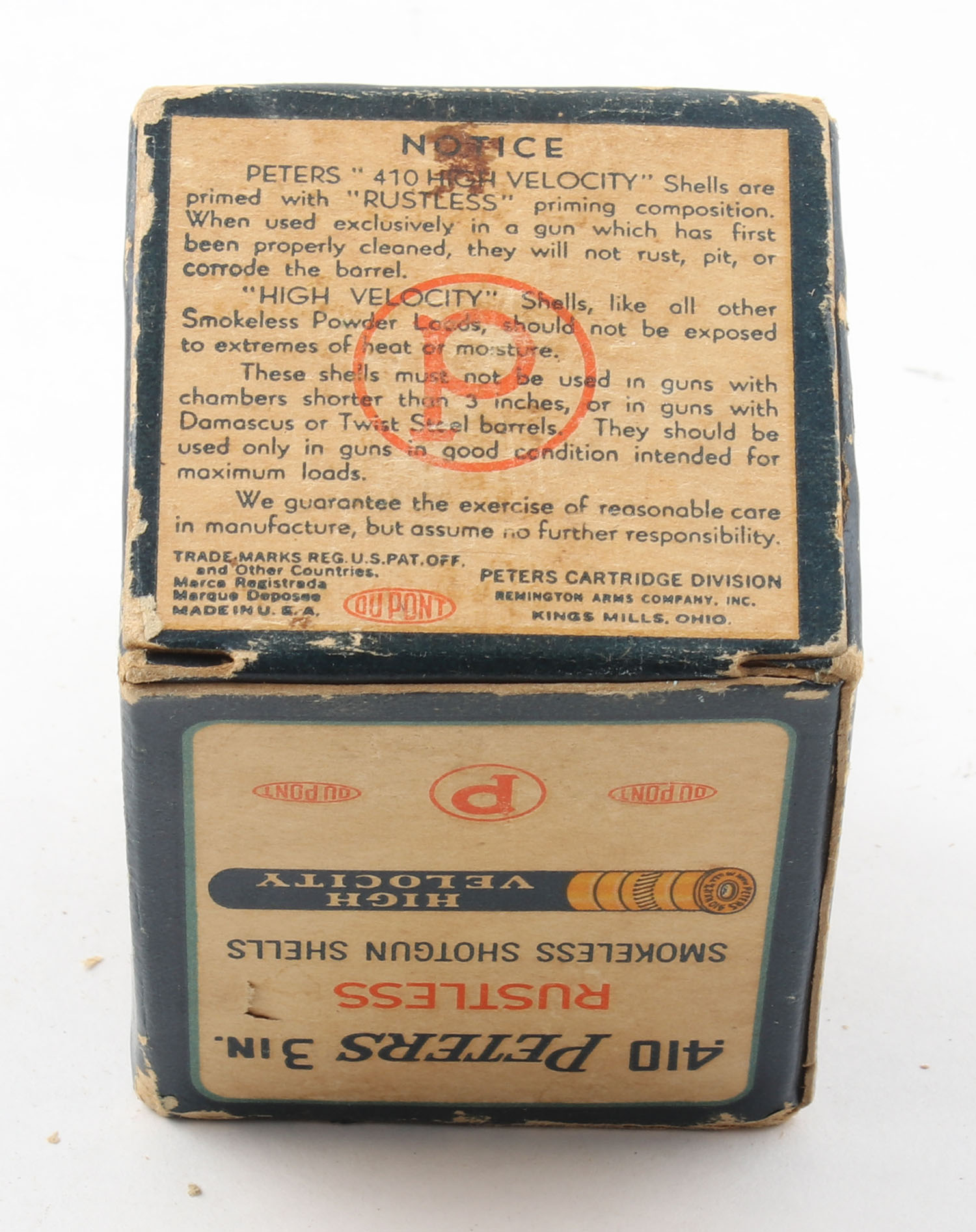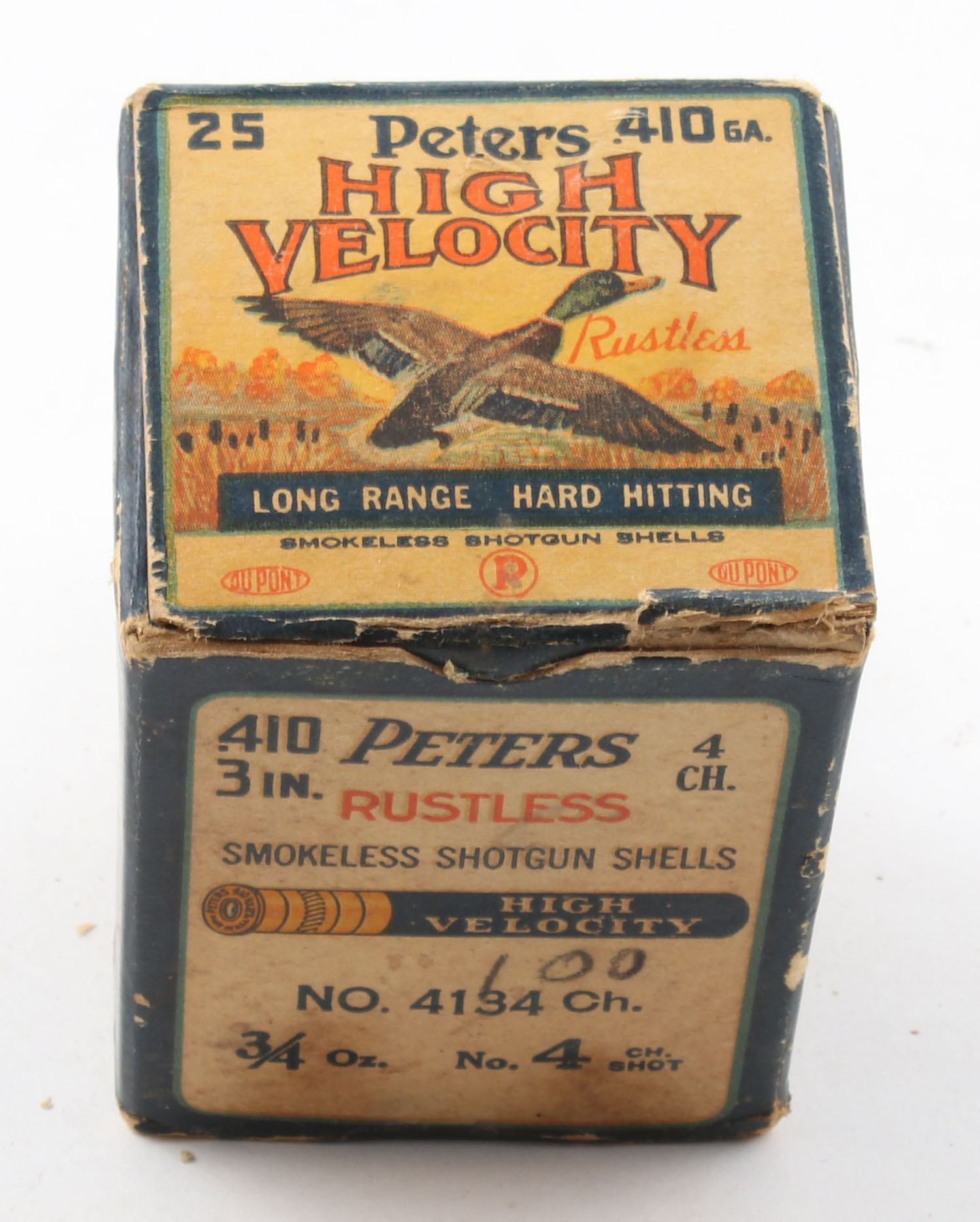 Peters, High Velocity, 410ga., 3 in., 1pc., Full, shot size 4 Ch, multi-colored box with mallard duck flying out of marsh grass, box has age soiling with edge wear, rare with duck on top flap, paper shells are excellent. Grade: Very Good - Value: 40 to 100