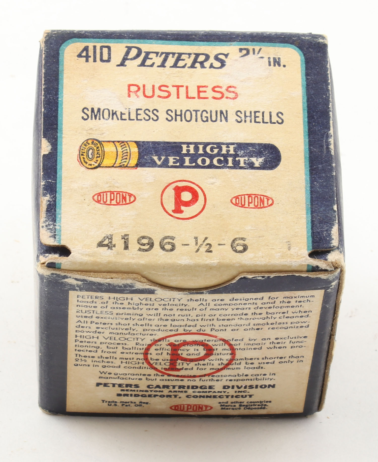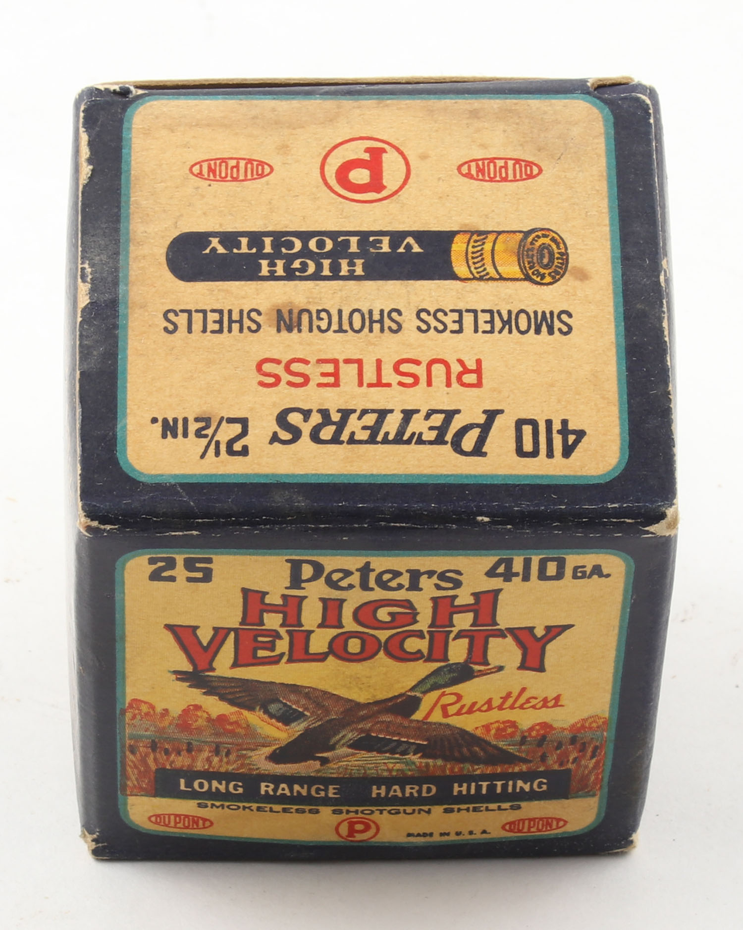 Peters, High Velocity, 410ga., 2 1/2'', 1pc., Full, shot size 6, multi-colored box with mallard duck flying out of marsh grass, box has some corner wear with excellent color, paper shells are excellent. Grade: Excellent - Value: 40 to 100