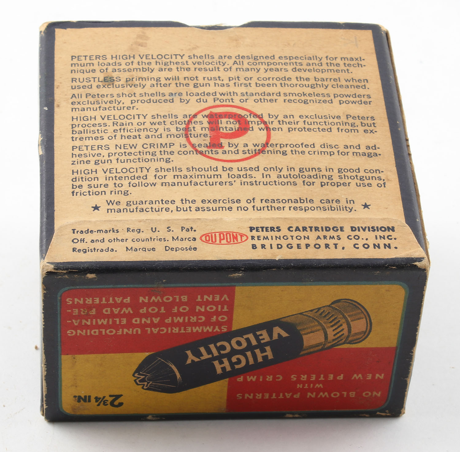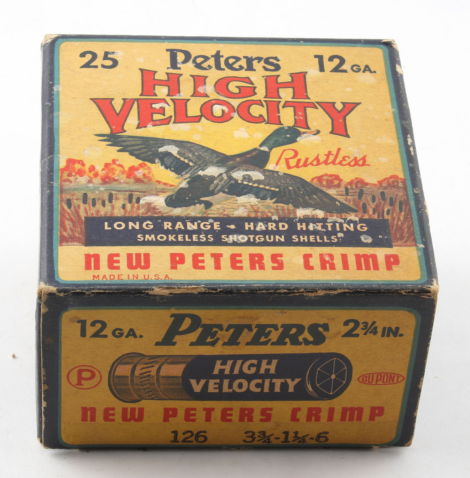 Peters Cart. Co., High Velocity, New Peters Crimp, 12ga., 1pc., Full of shot size 6, 2 3/4'', multi colored box that pictures mallard flying out of the marsh grass, box has light edge & corner wear with excellent color, paper shells are excellent. Grade: Very Good ++ - Value: 20 to 60
