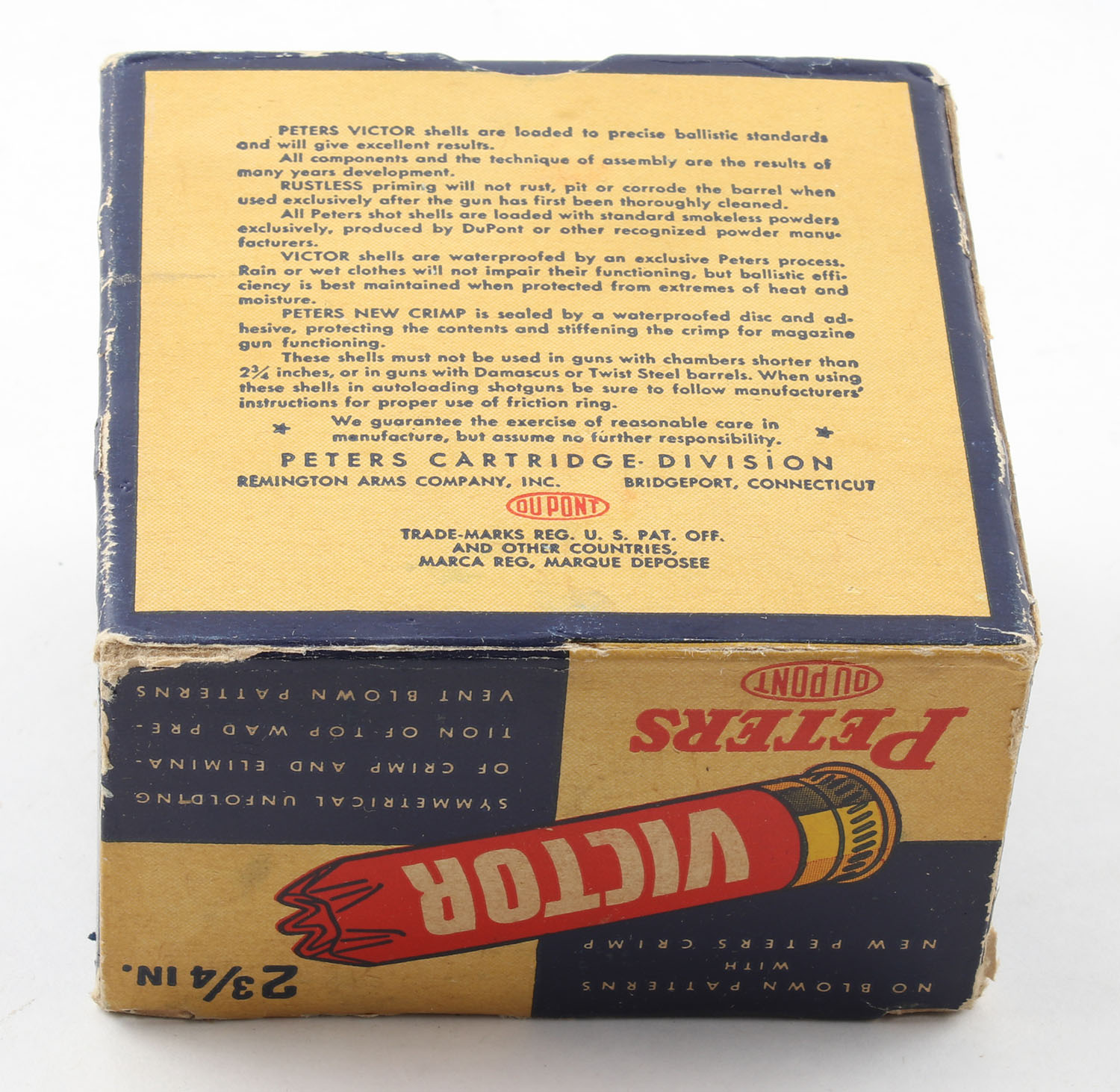 Peters, VICTOR Field Loads, 12ga., 1pc., Full, shot size 6, blue, yellow & red box, box is very solid with excellent colors, has light edge wear, paper shells are excellent. Grade: Excellent - Value: 20 to 60