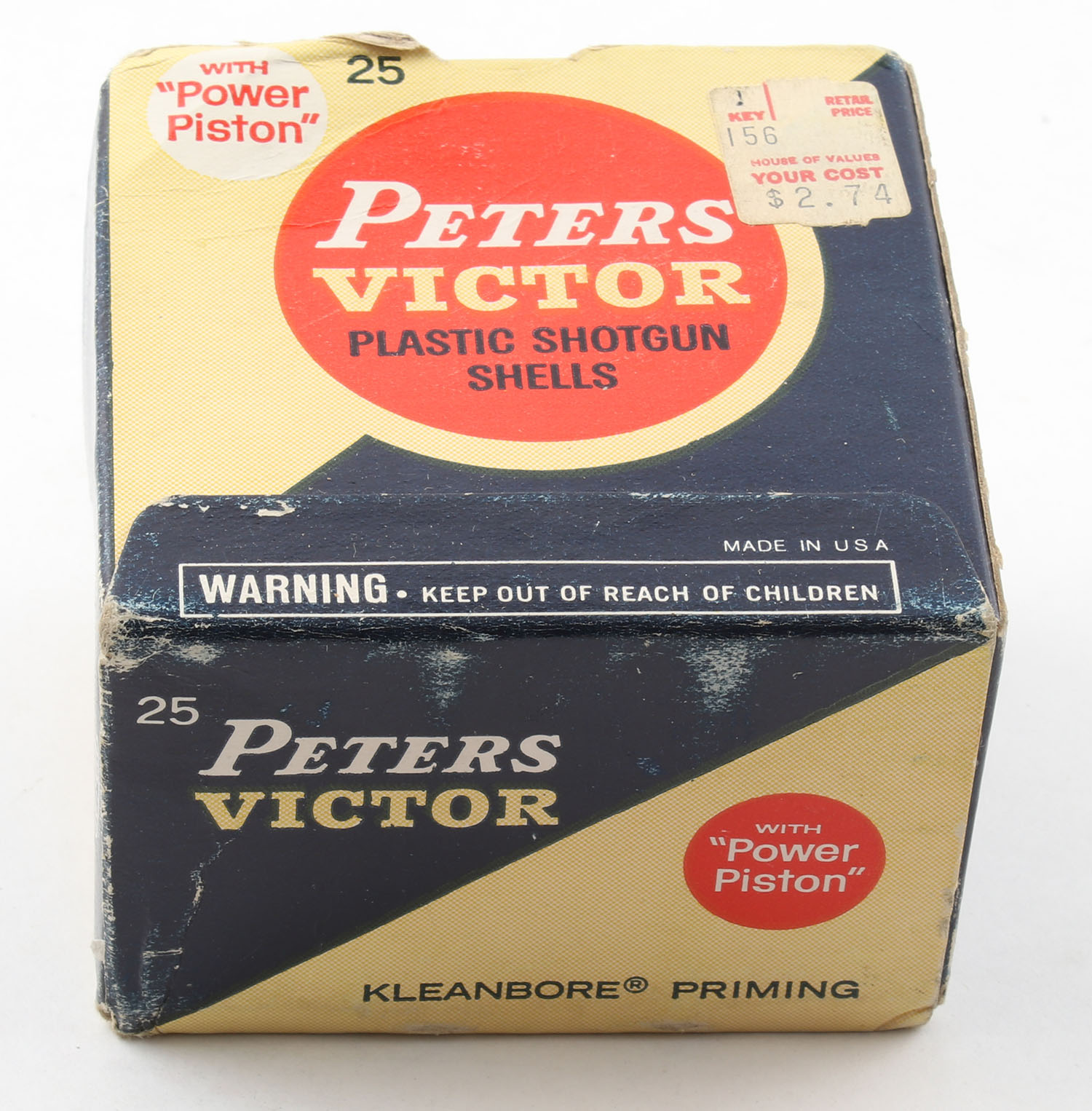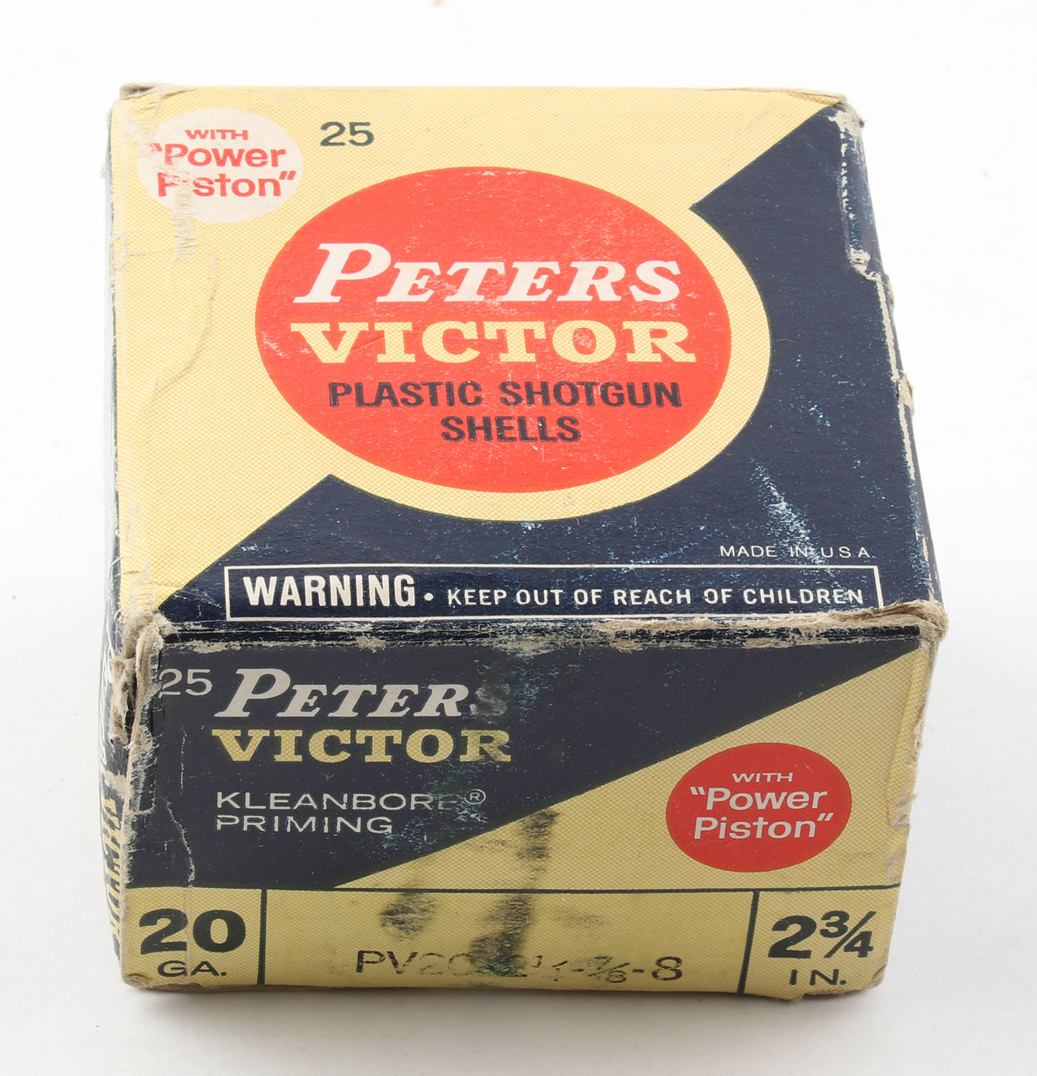 Peters, VICTOR, 20ga., 1pc., Partial 24rds, shot size 8, orange, blue & tan box, box has scuffing & edge wear, plastic shells are very good. Grade: Good - Value: 10 to 30