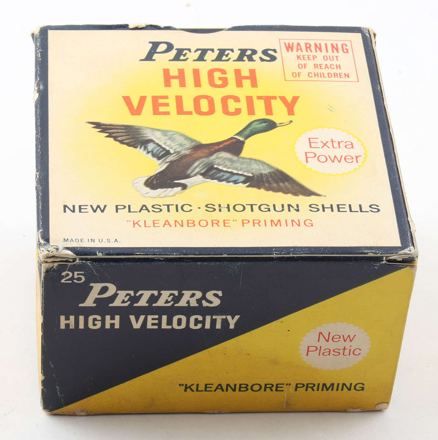Peters Cart. Co., High Velocity, 12ga, 2 3/4'', 1pc., Full, shot size 00 Buck, multi colored box that pictures mallard flying, box is solid with light scuffing, plastic shells are excellent. Grade: Excellent - Value: 10 to 30