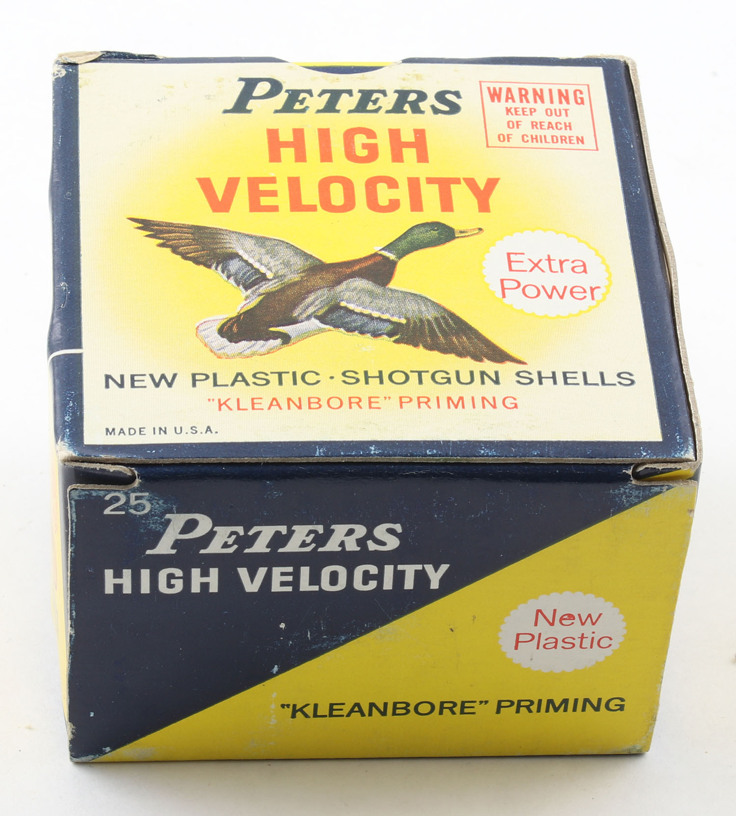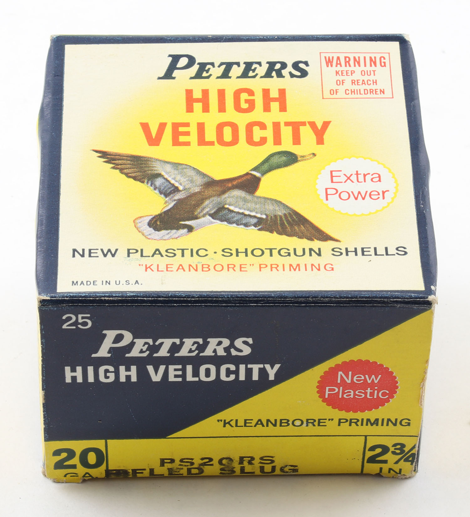 Peters Cart. Co., High Velocity, 20ga, 2 3/4'', 1pc., Full, shot size Rifled Slug, multi colored box that pictures mallard flying, box is solid with great color, plastic shells are very good. Grade: Excellent - Value: 10 to 40