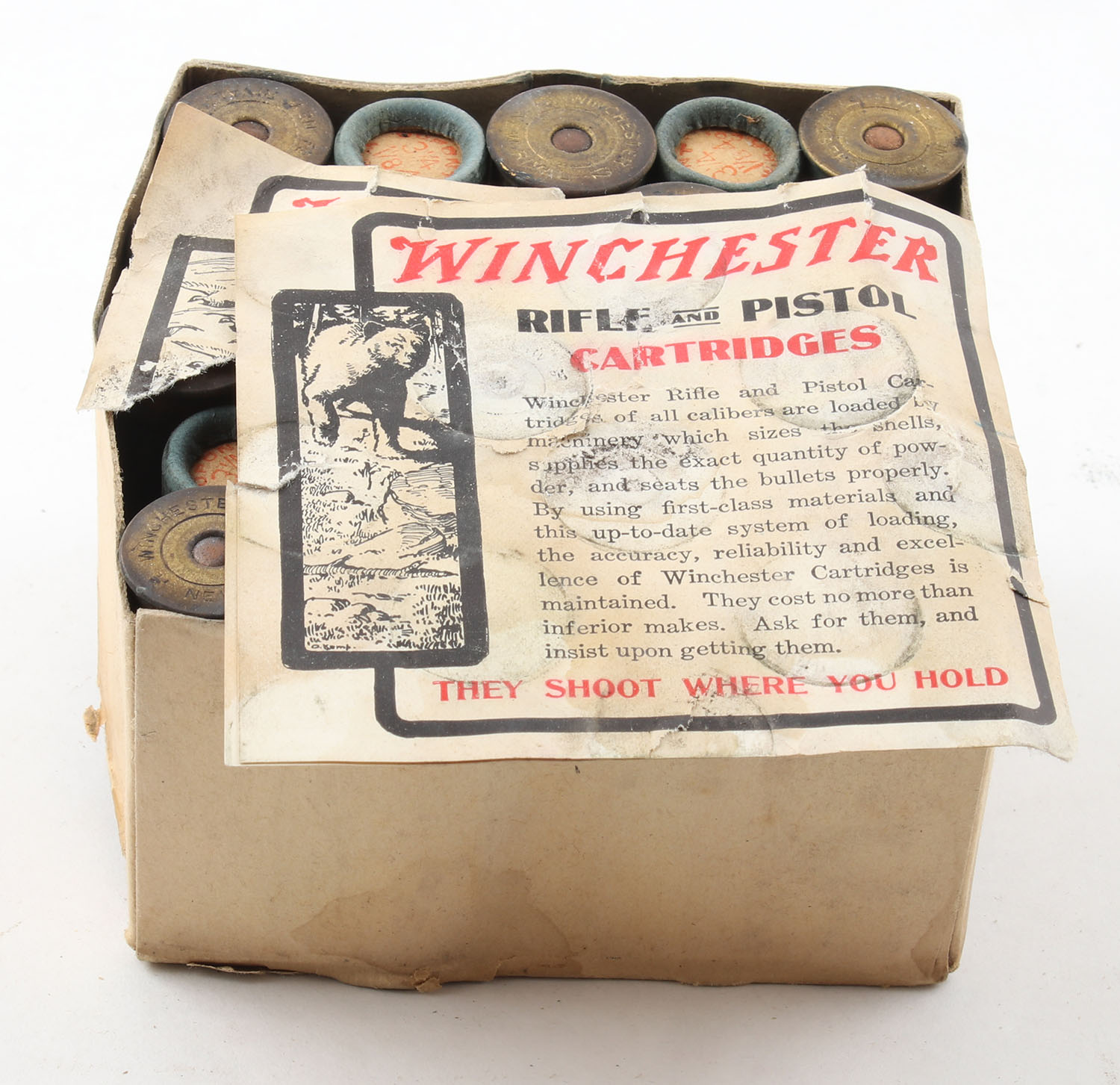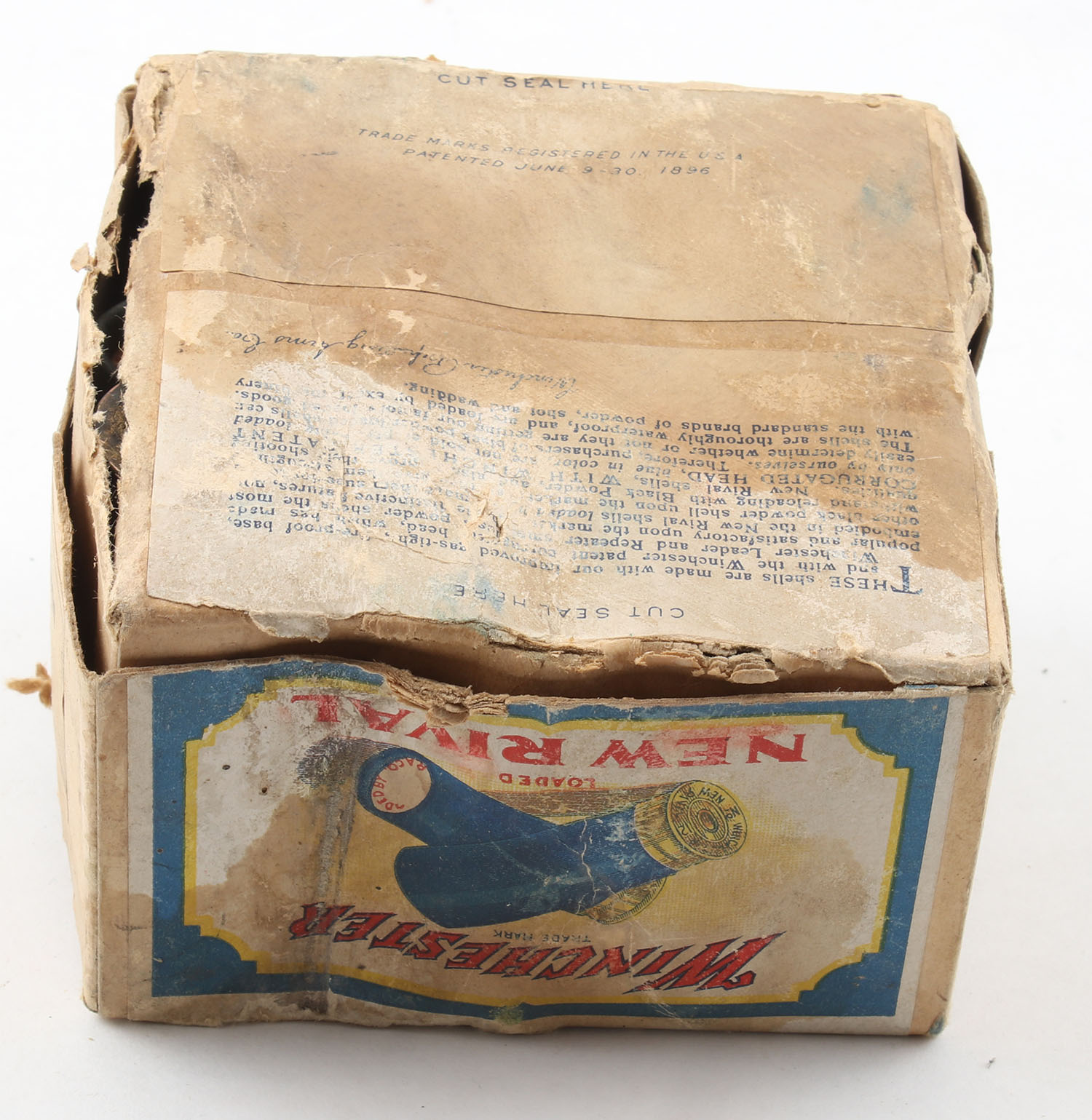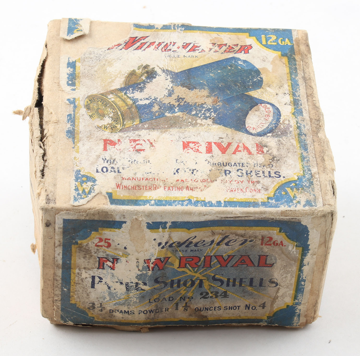 Winchester, NEW RIVAL, 12ga., 2pc., Full with Insert, shot size 4, buff box with multi-colored label that pictures the two crossed shells, loaded BLACK POWDER shells, box has age soiling & scuffing with edge wear, shell protrusion to bottom, paper shells are very good. Grade: Good - Value: 40 to 100
