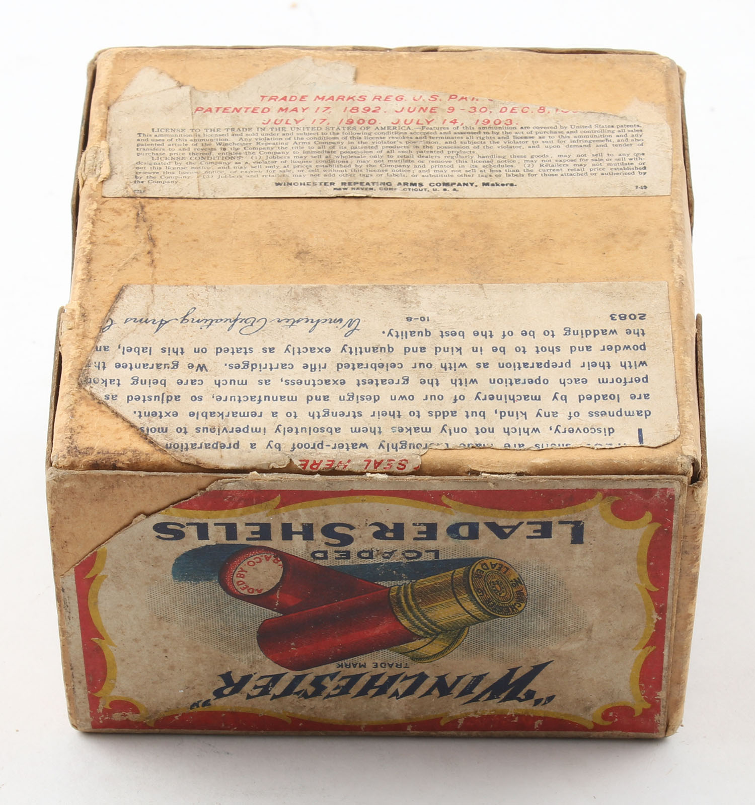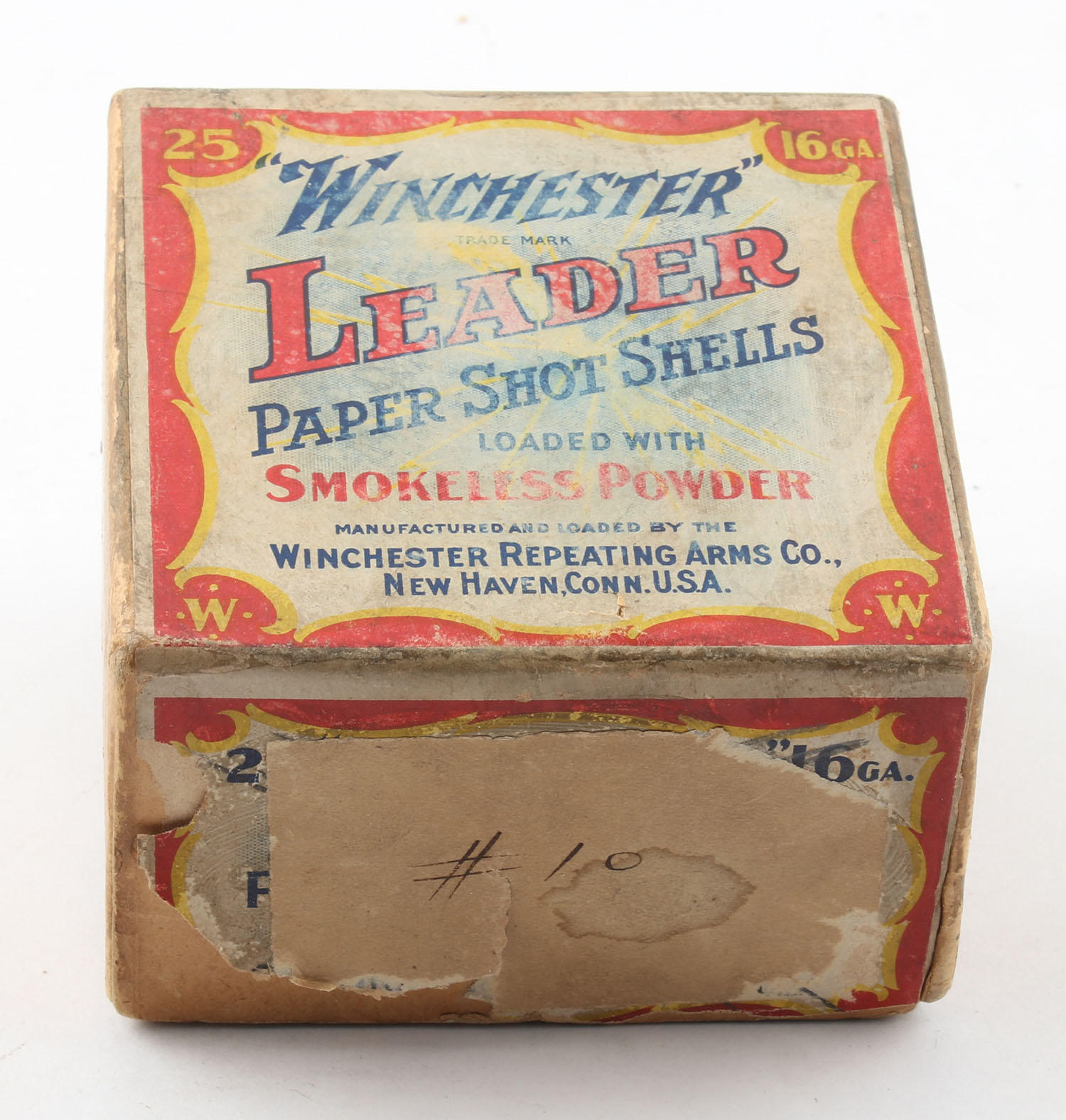 Winchester, LEADER, 16ga, 2pc., Empty, shot size unknown, Buff box with red, yellow, white & black label showing lightning bolt, box has age soiling & scuffing, side label has a partial tear, label is about 80% intact. Grade: Good - Value: 50 to 100