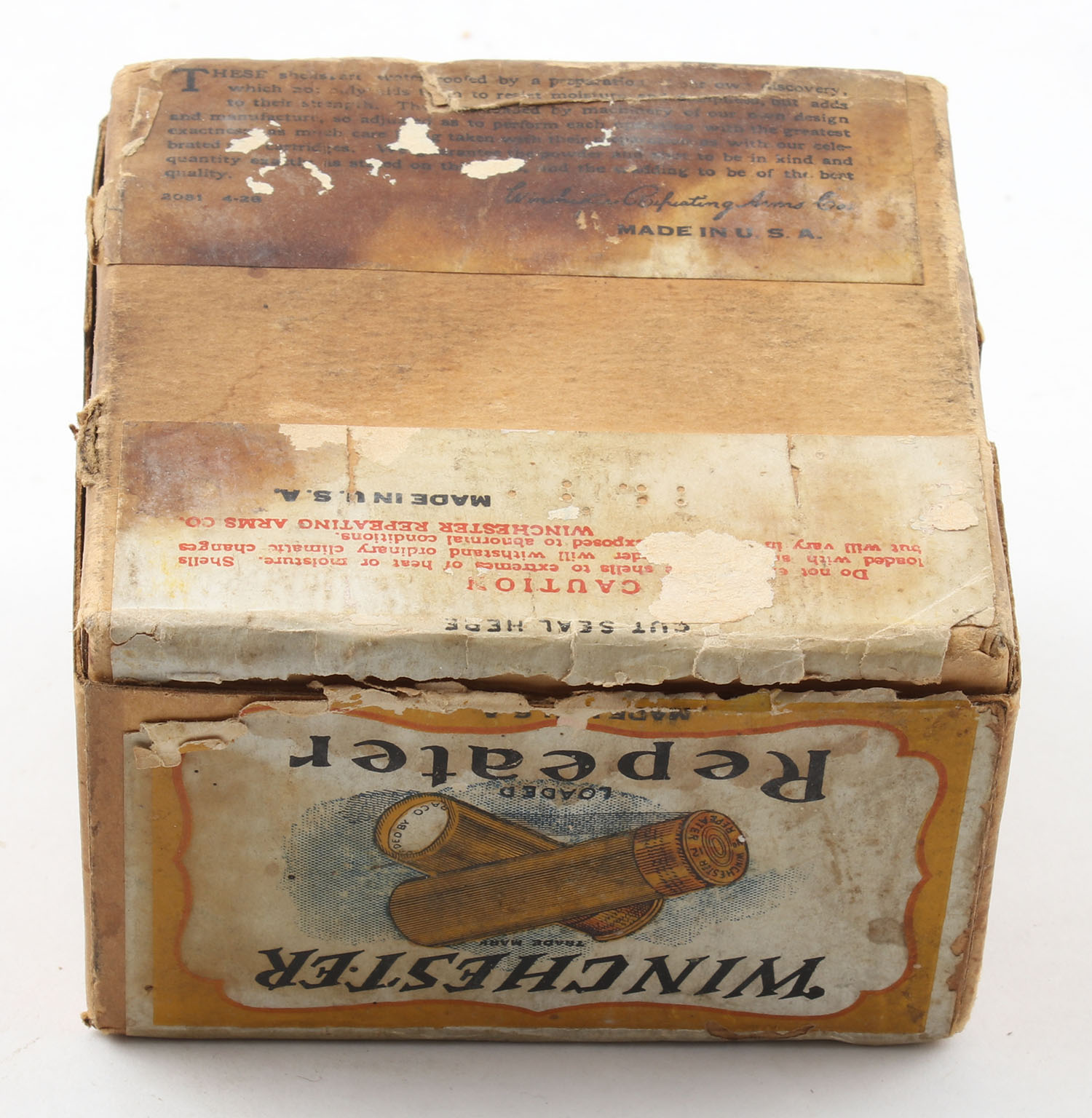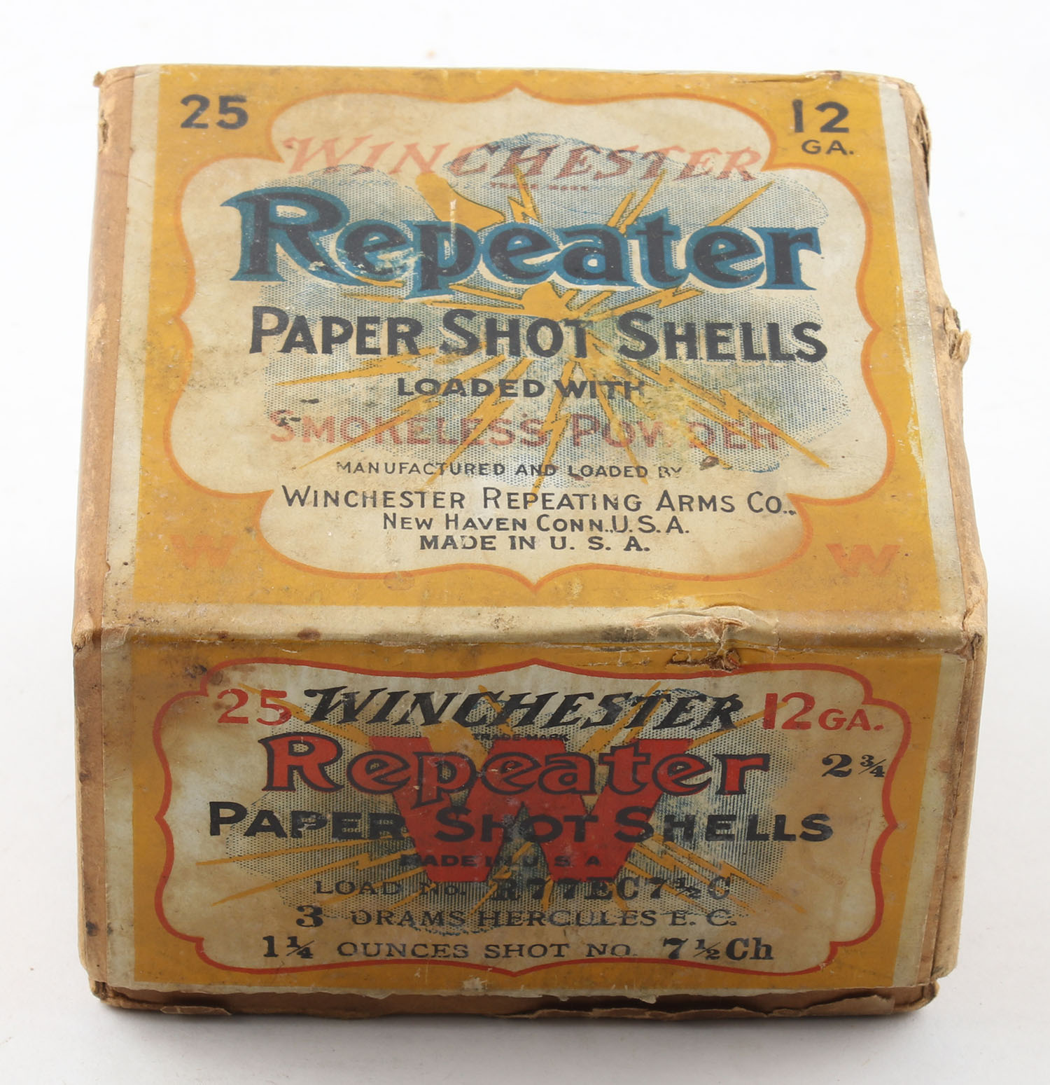Winchester, REPEATER, 12ga., 2pc., Full, Loading: No. R77EC1/2C, 3 Drams Hercules E.C., 1 1/4 Oz., Shot size 7 1/2Ch., Full, Buff box with yellow, white & red label showing lightning bolt, box has scuffing with age soiling & edge wear, paper shells are excellent. Grade: Very Good - Value: 50 to 120
