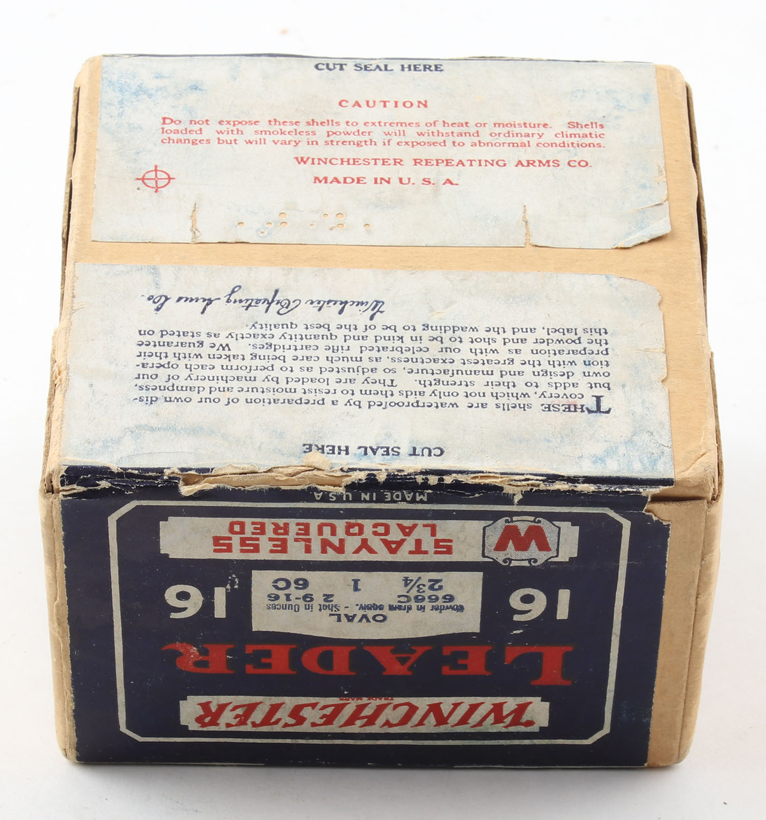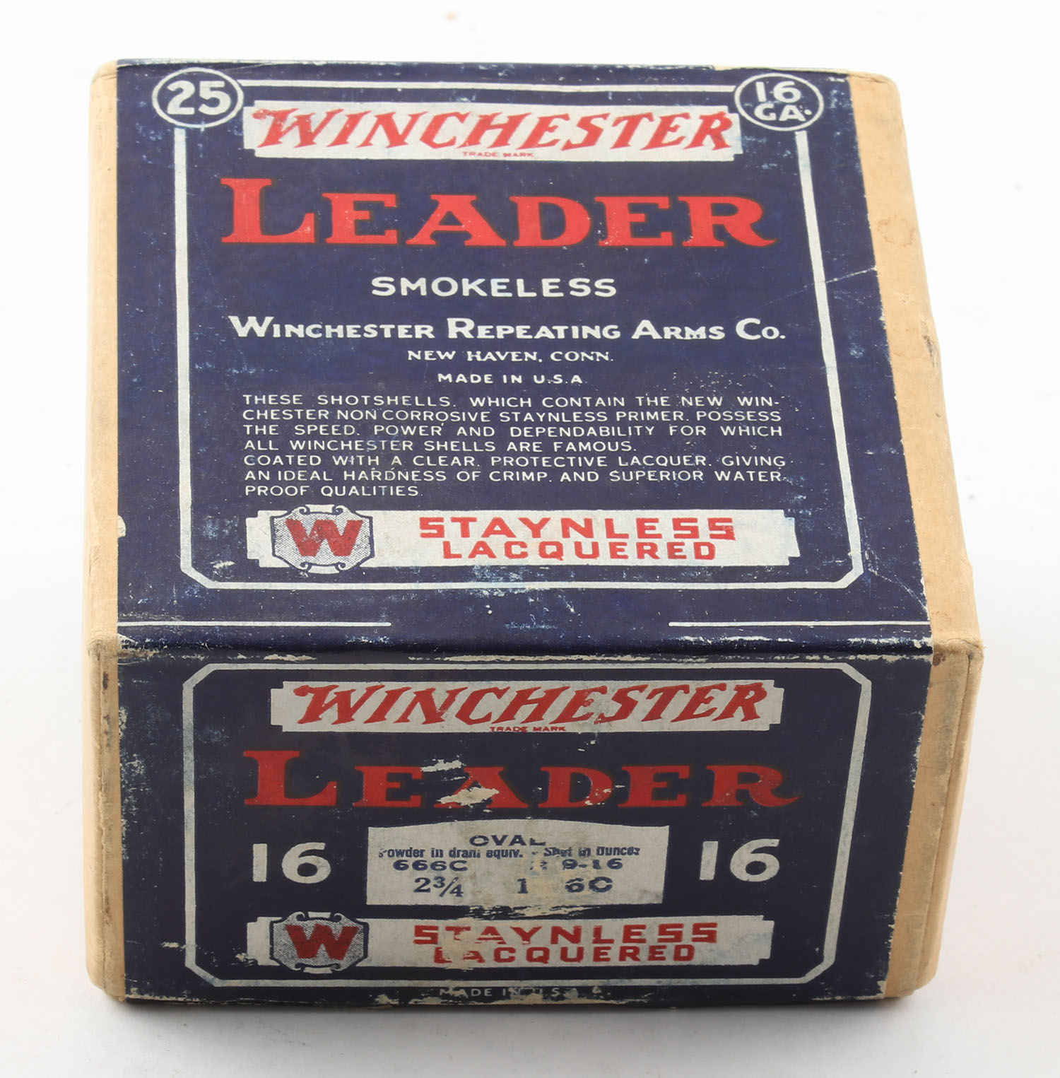 Winchester, LEADER, Staynless Lacquered, 16ga., 2pc., FULL & SEALED, shot size 6C, buff box with blue, red & white label, box is very solid with light edge wear, light scuffing to bottom, excellent color to label. Grade: Excellent + - Value: 100 to 400