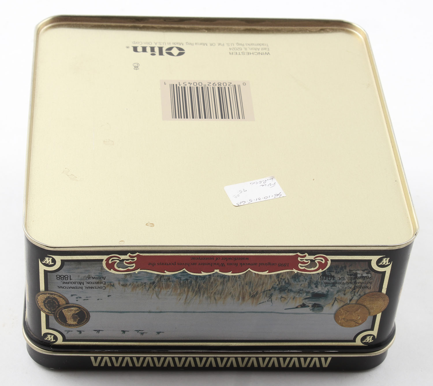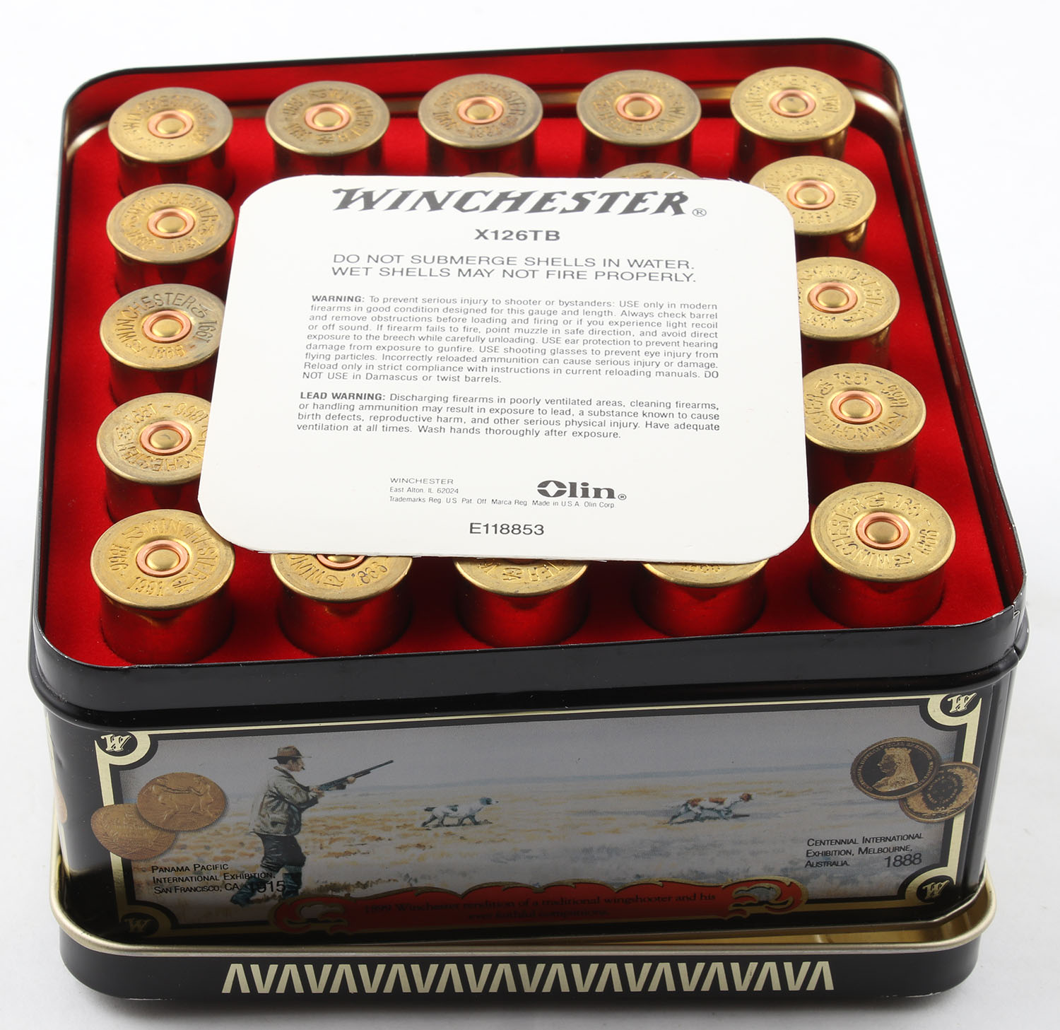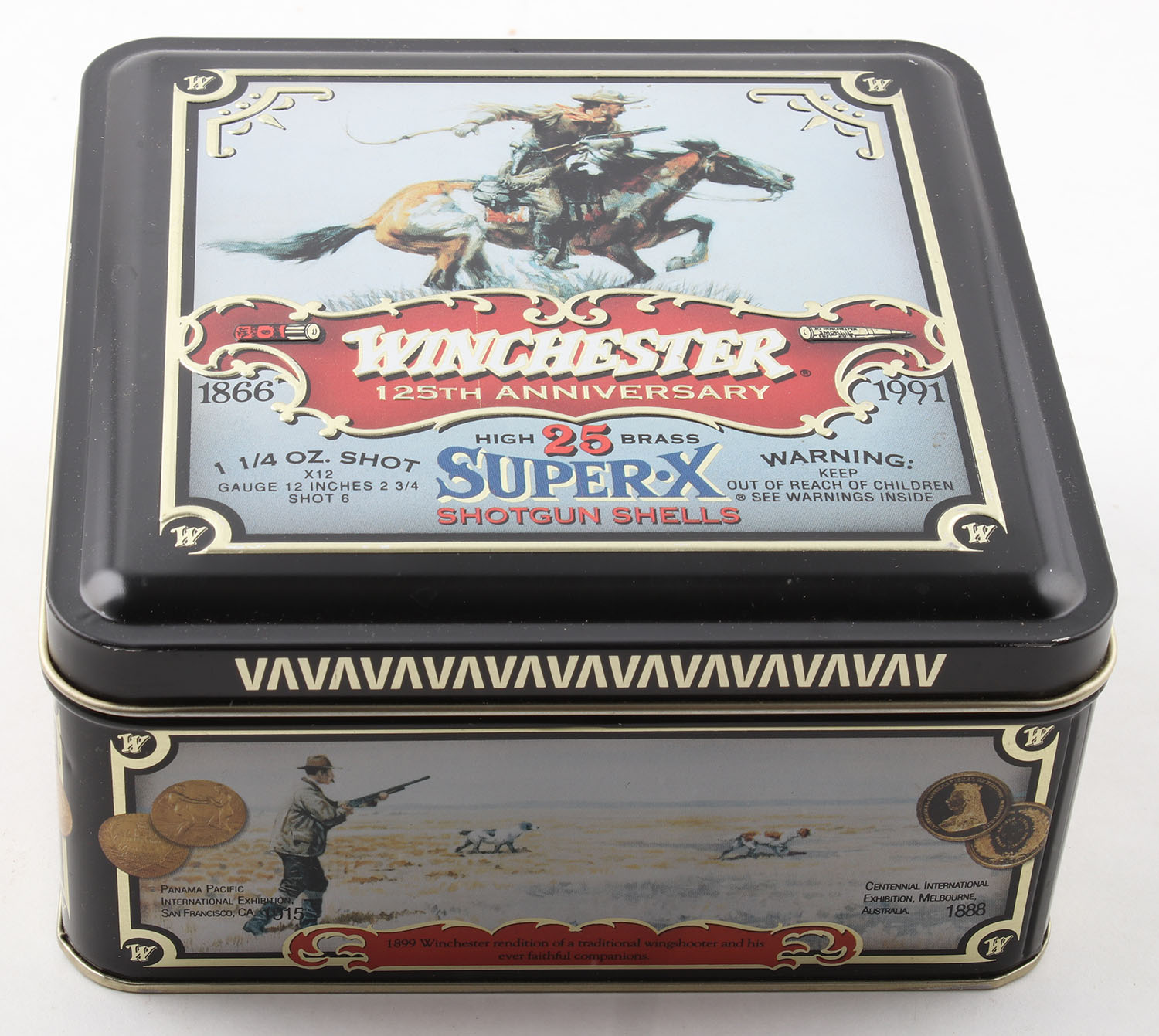 Winchester, Super-X 125th ANNIVERSARY, 1866-1991, 12ga., 2pc., shot size 6, 2 3/4'', FULL, 25 count metal tin, has Insert, plastic shells are excellent. Grade: Excellent + - Value: 40 to 100