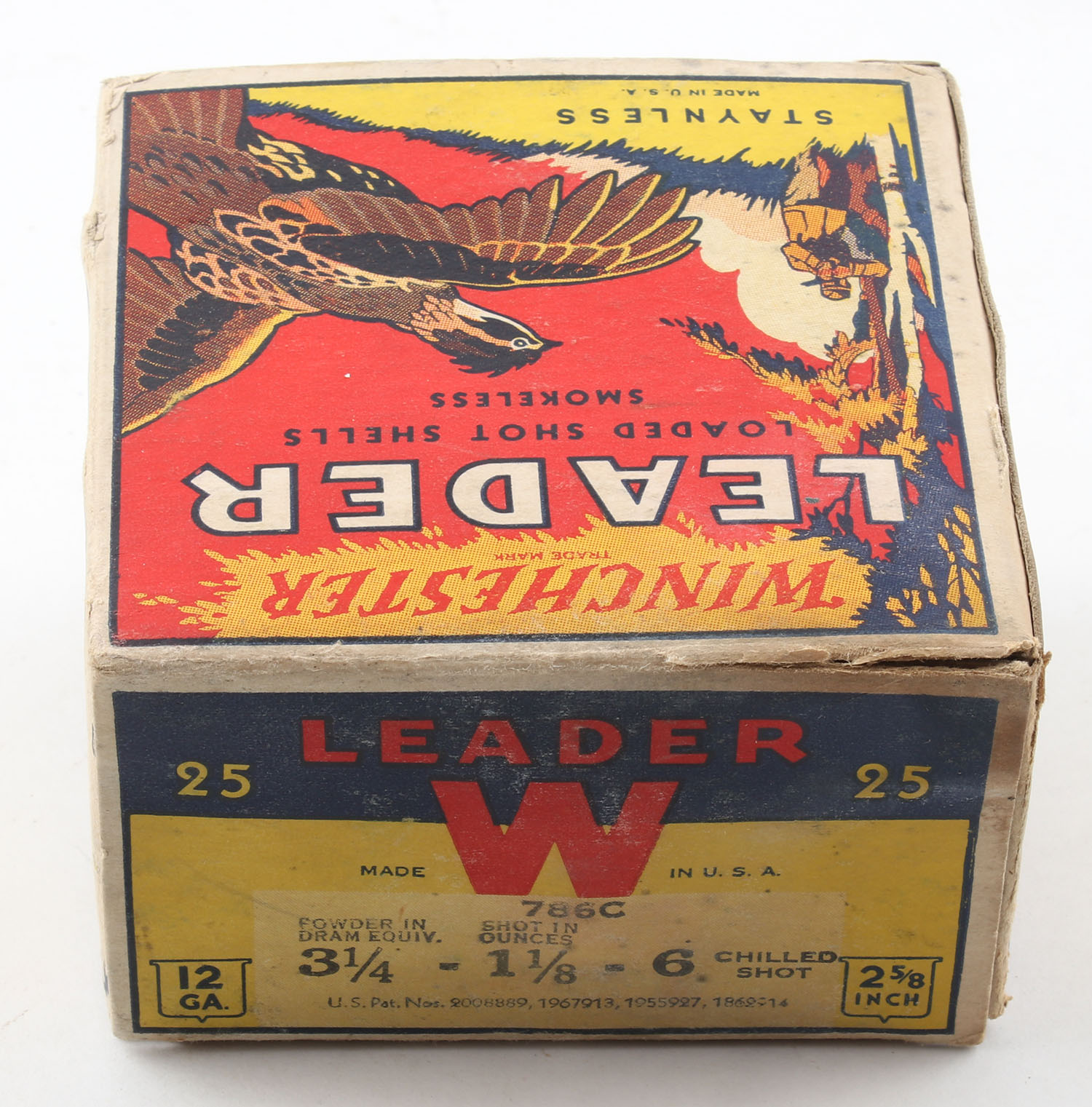 Winchester, LEADER QUAIL BOX, 12ga., 1pc., Full, shot size 6 CH, 2 5/8'', multi colored box with flying Quail & hunter in background, box has light age soiling with light shell protrusions, has edge & corner wear with some scuffing, paper shells are very good. Grade: Very Good ++ - Value: 500 to 1000