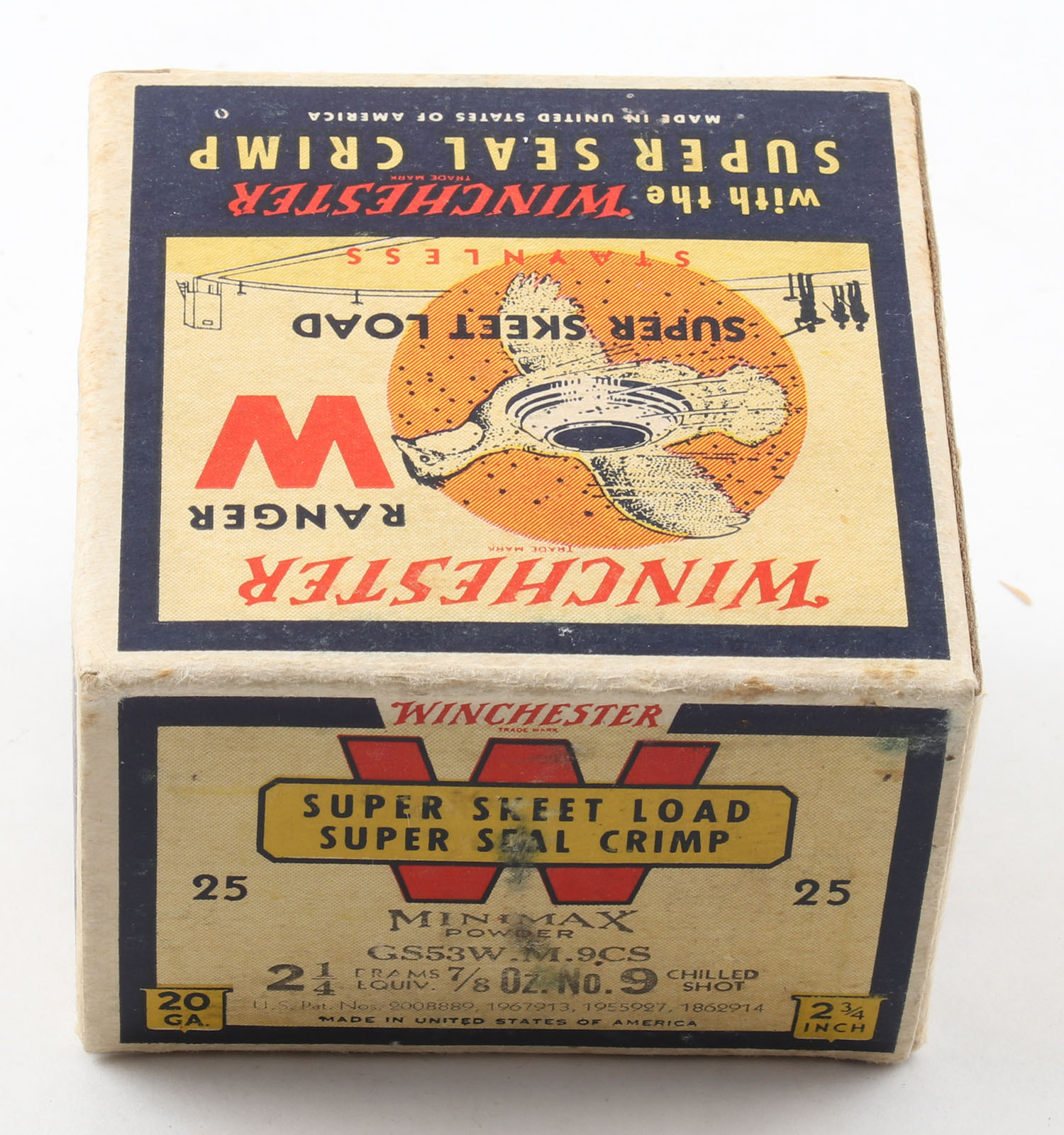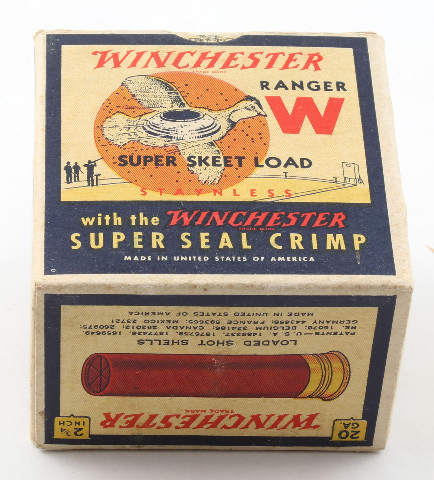Winchester, Ranger Super Skeet Load, Minimax Powder, 20ga, 1pc., 2 3/4'', Full, White, blue & red box that pictures flying Quail with skeet in body & shot all around, Loading: 2 1/4 Drams, 7/8 Oz., No. 9CH Shot, Box is very solid with great colors, paper shells are excellent. Grade: Excellent + - Value: 200 to 500