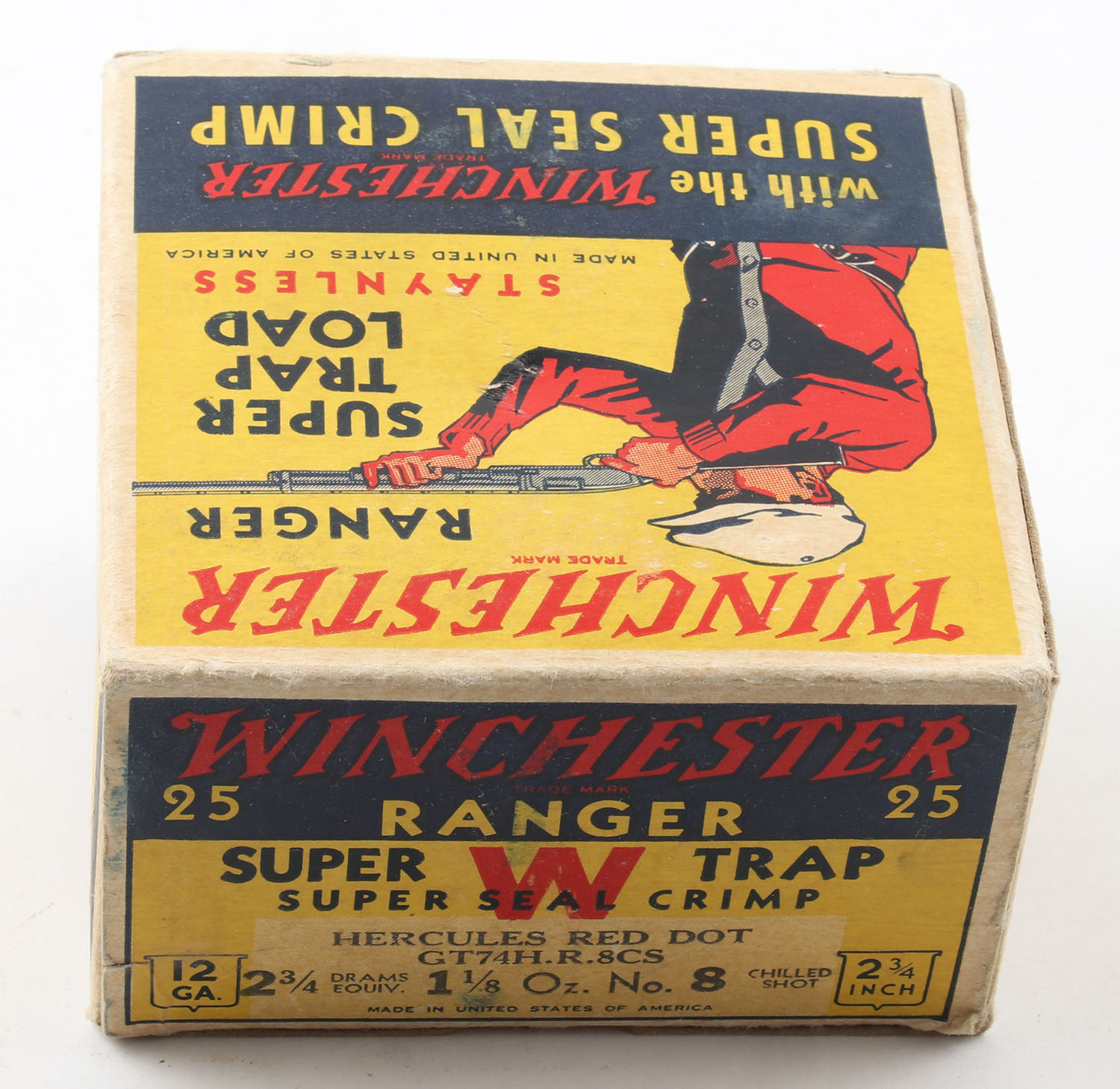 Winchester, Ranger Super Trap Load, 12ga., 1pc., Full with 18rds being correct, 2 3/4'', Hercules Red Dot, shot size 8Ch., yellow, blue & red box that pictures trap shooter, box has light edge wear with excellent colors, paper shells are excellent. Grade: Excellent - Value: 100 to 300