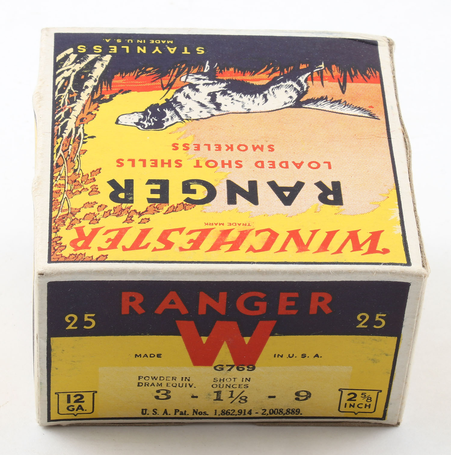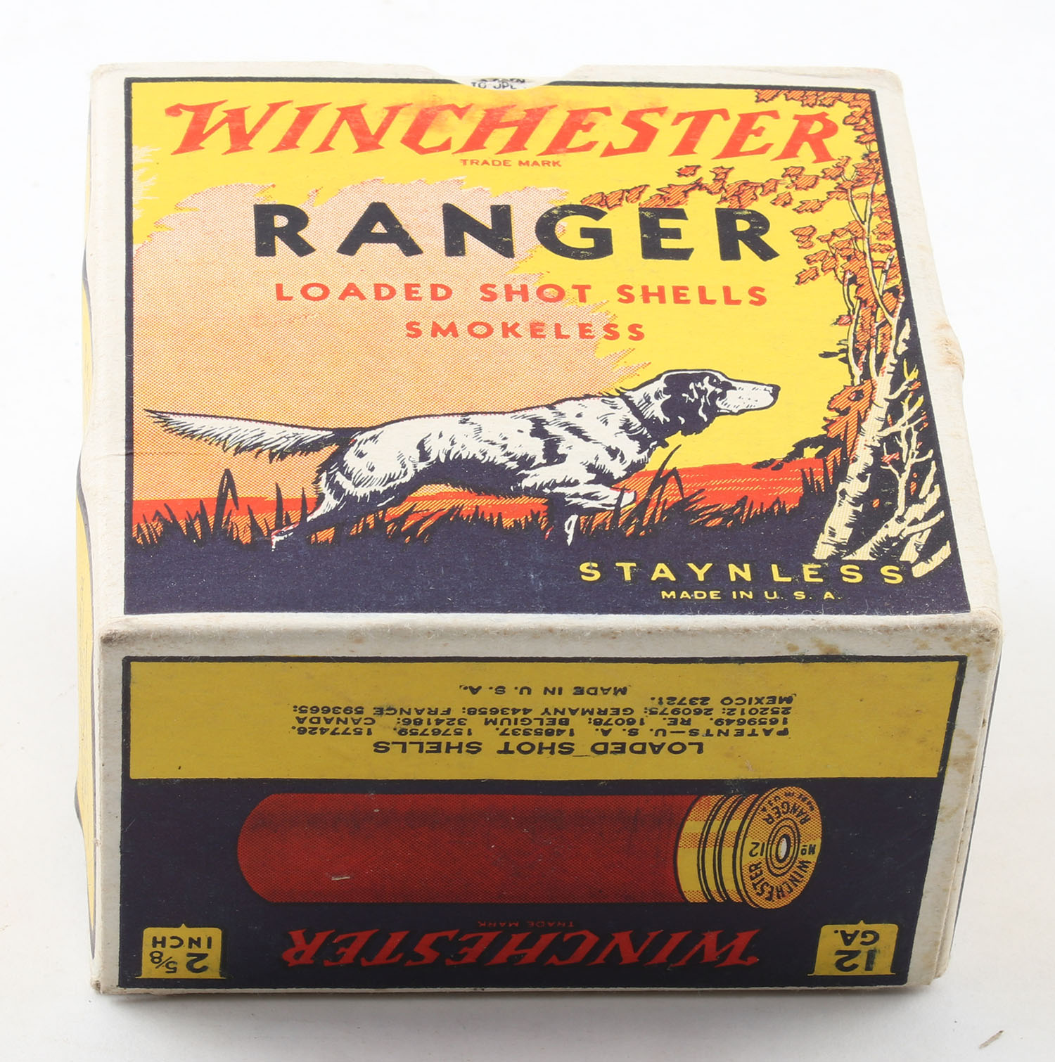 Winchester, Ranger, 12ga, 1pc., Full, Shot Size 9, multi colored box, dog on point, 2 5/8'', box is very solid with excellent colors, box shows very minor shell protrusion, paper shells are excellent. Grade: Excellent ++ - Value: 80 to 200