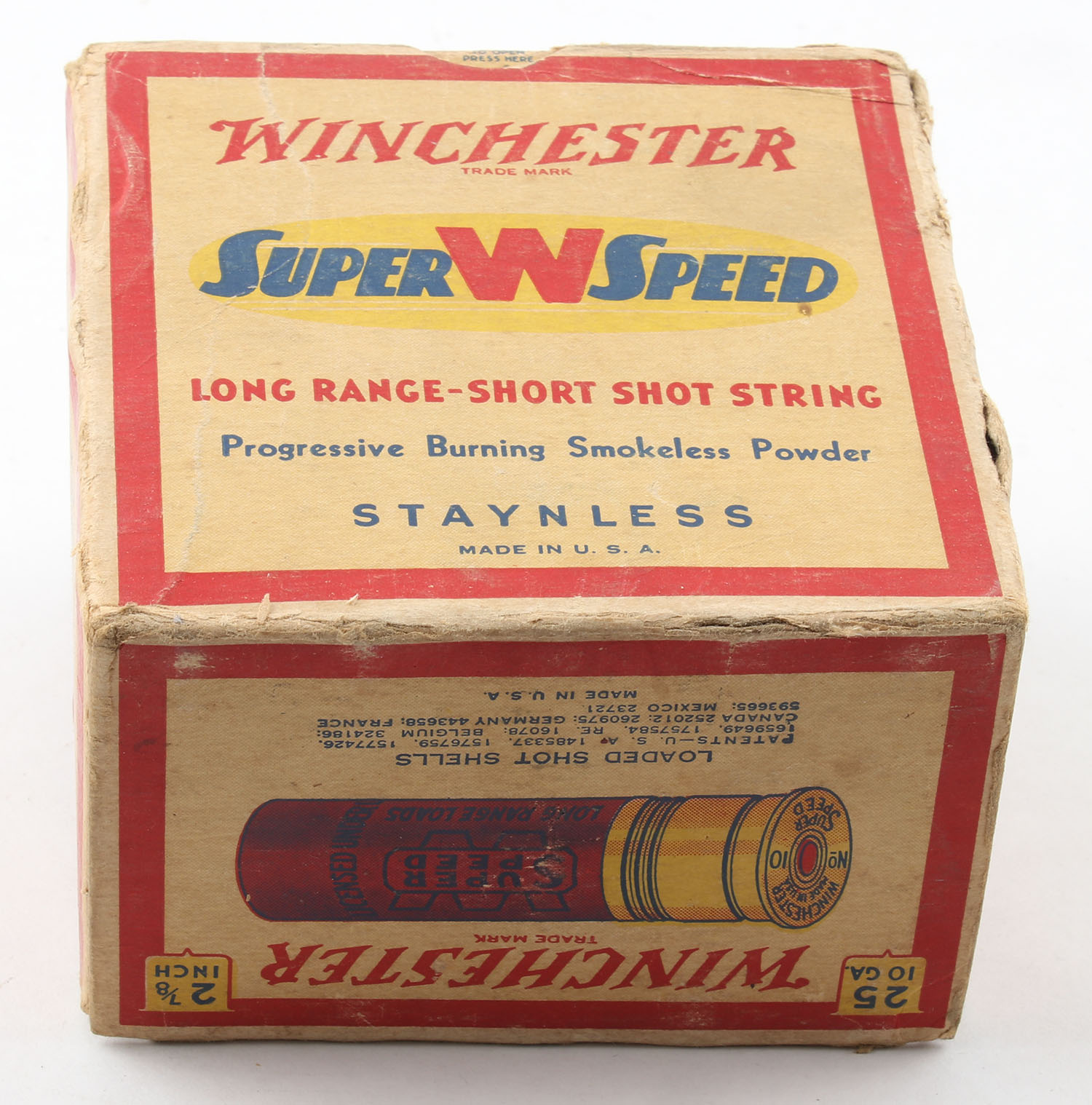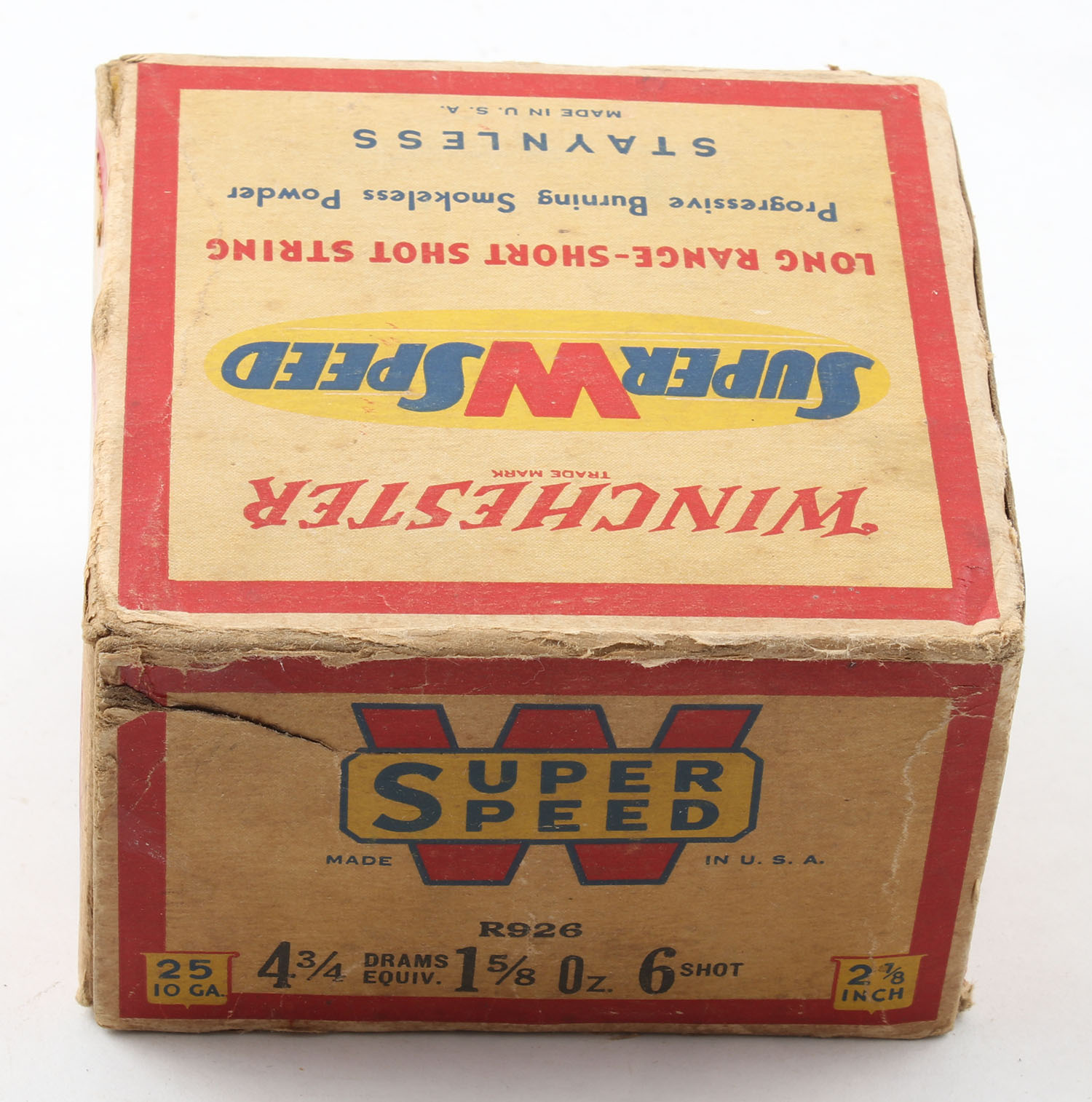 Winchester, Super W Speed, Staynless, 10ga., 2 7/8'', 1pc., Full, shot size 6, cream red, blue and yellow box, box has light age soiling with edge wear, paper shells are excellent. Grade: Very Good ++ - Value: 40 to 100