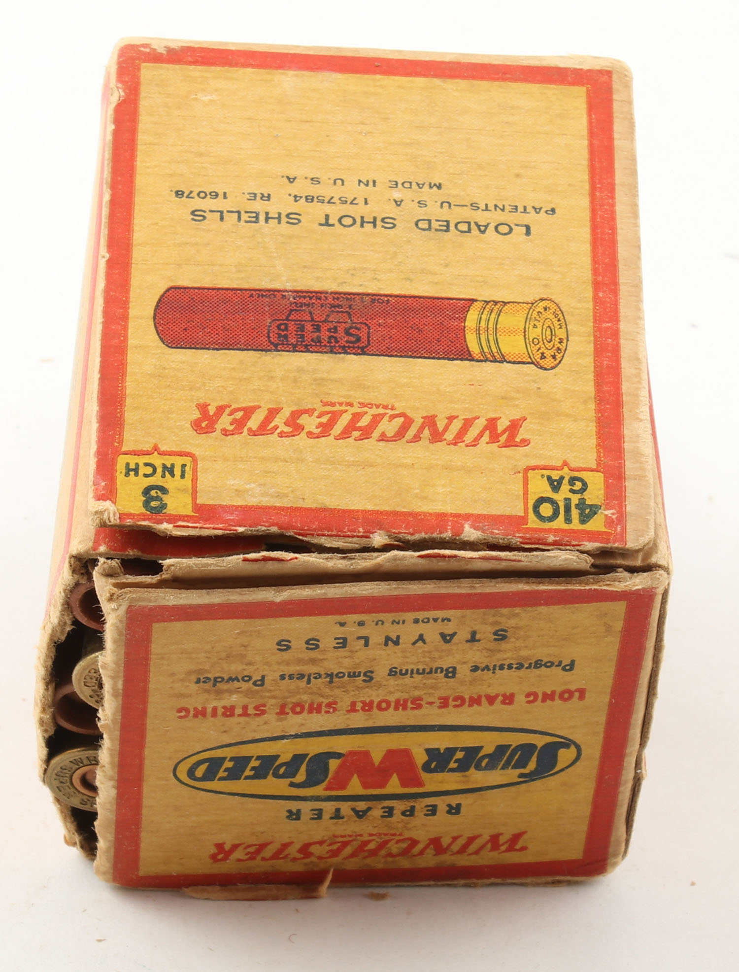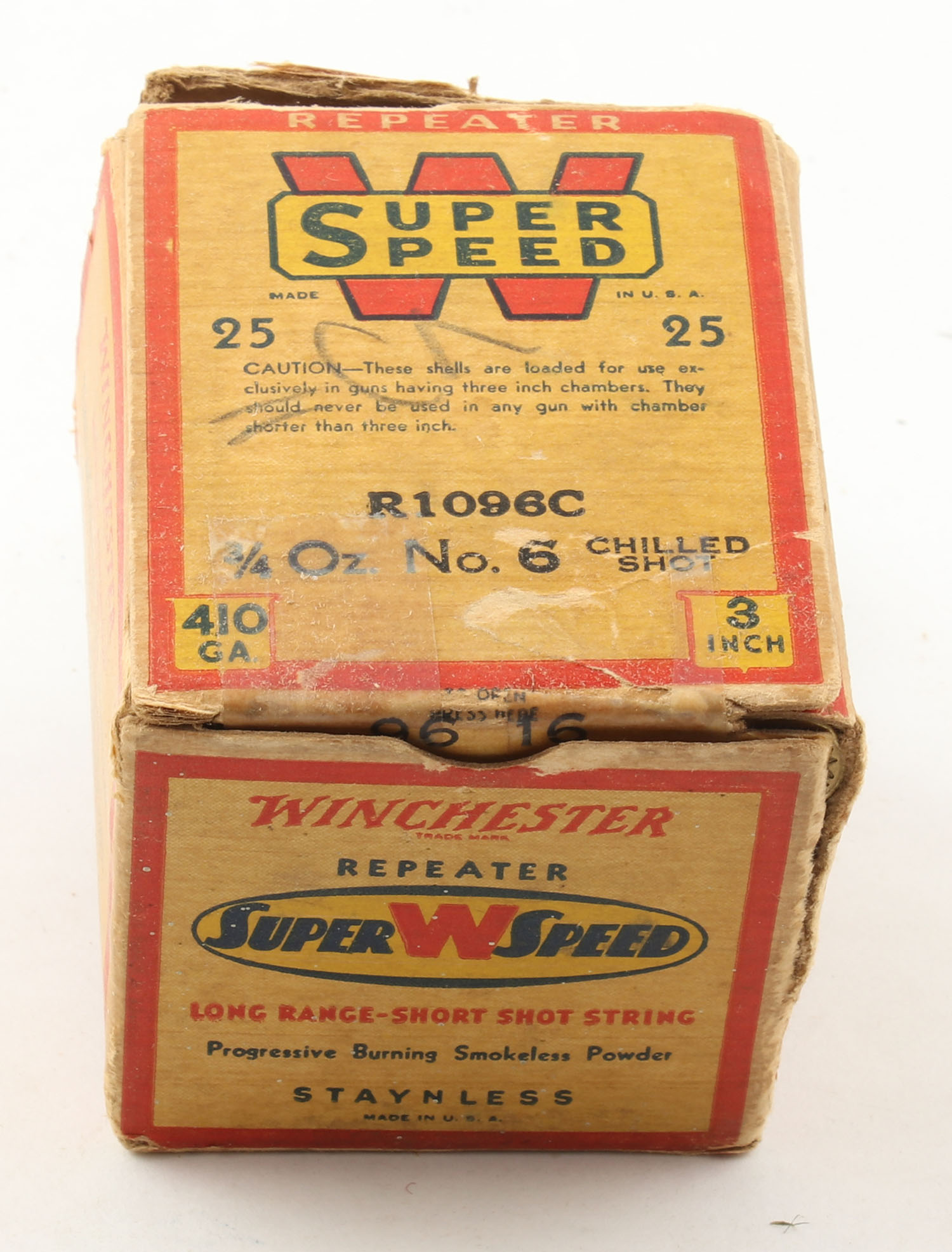 Winchester, Super W Speed, 410ga., Staynless, 3'', 1pc., Full, shot size 6 CH, cream, red, blue and yellow box, box has light age soiling with edge wear, has a partial seam split with some tape repairs, paper shells are excellent. Grade: Very Good - Value: 20 to 60