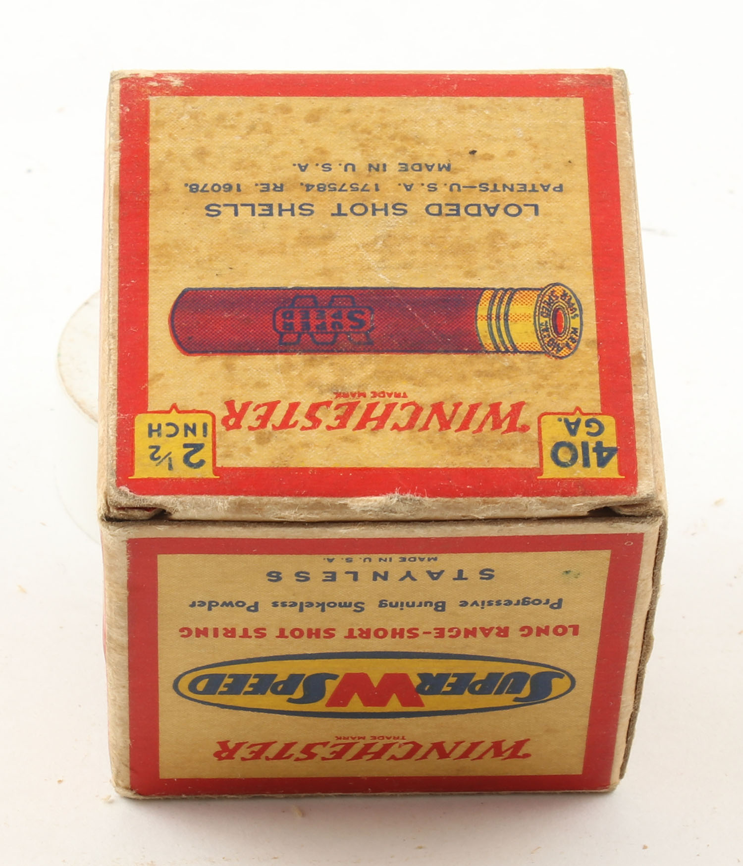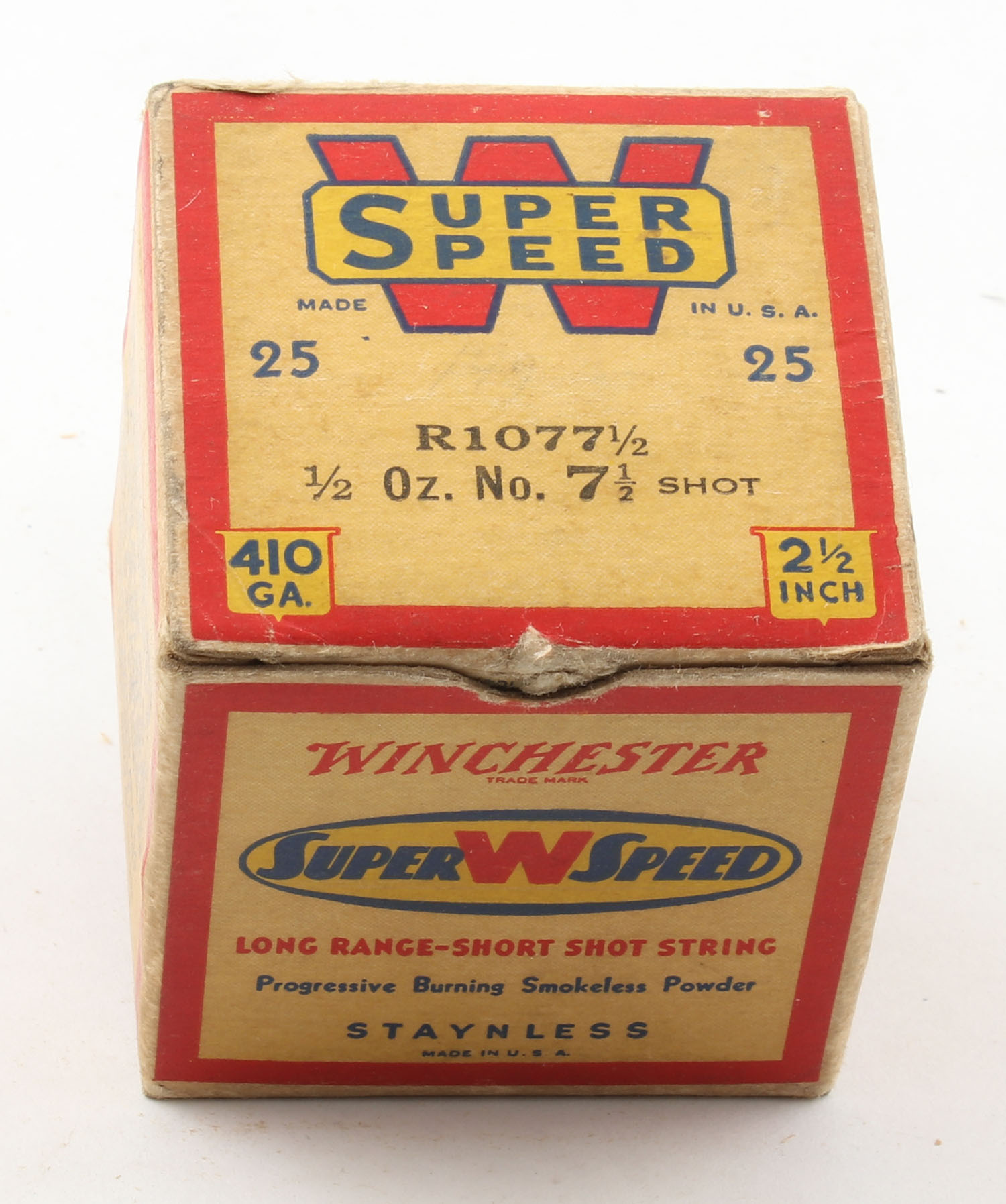 Winchester, Super W Speed, Staynless, 410ga., 2 1/2'', 1pc., Full, shot size 7 1/2, cream red, blue and yellow box, box has light age soiling with great colors, paper shells are excellent. Grade: Very Good ++ - Value: 20 to 60