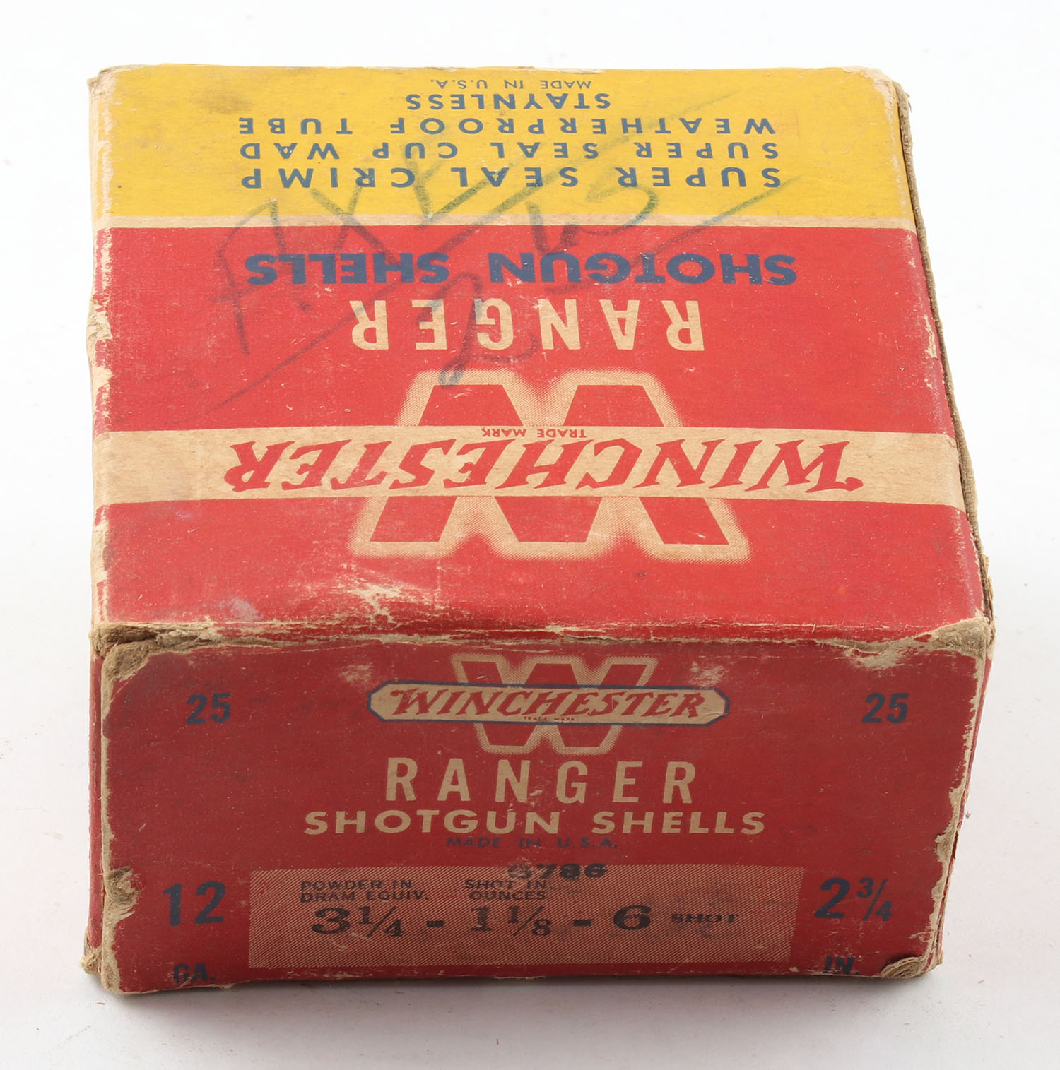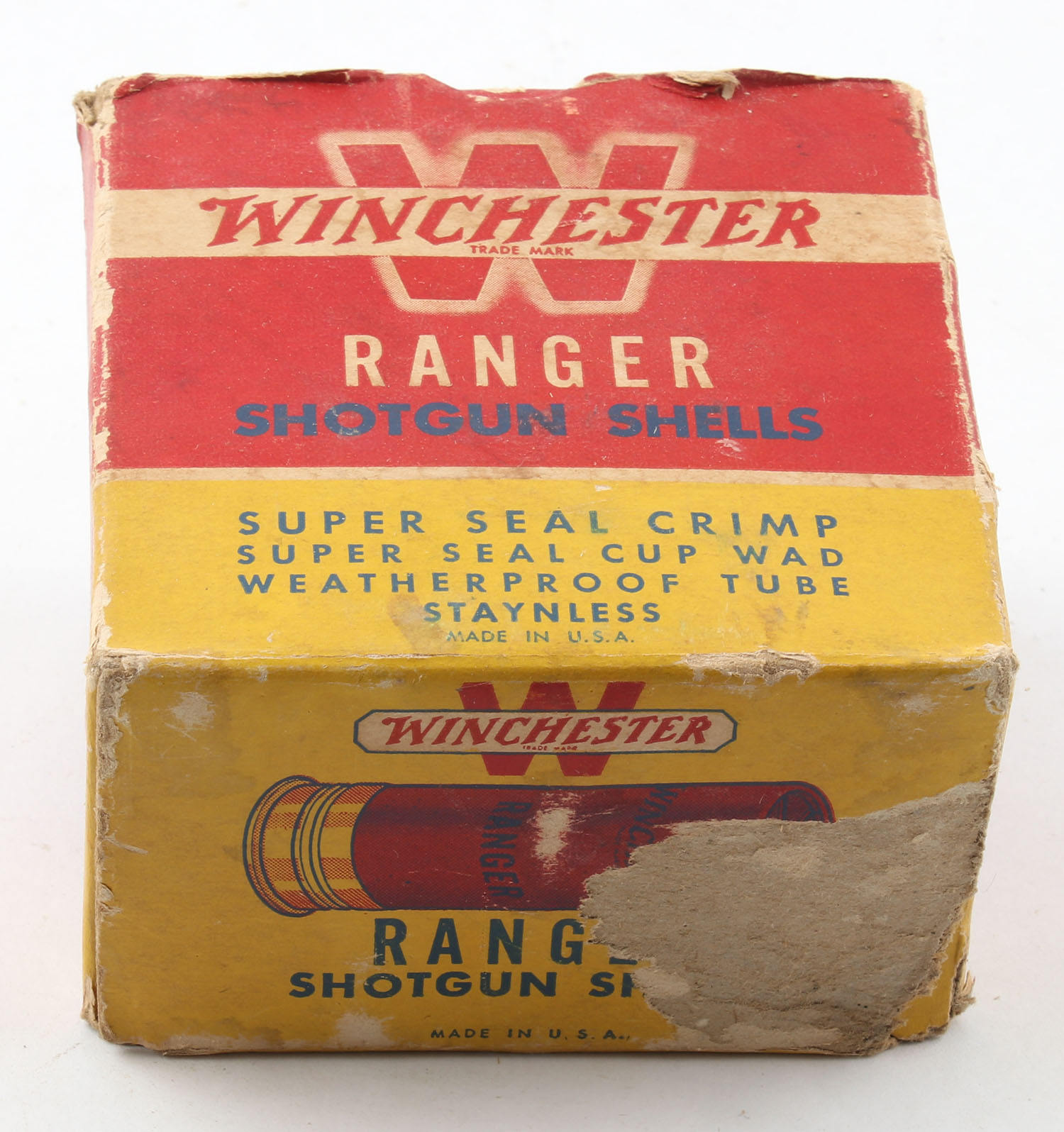 Winchester, Ranger, 12ga., 1pc., Full, 2 3/4'', shot size 6, Red, white & yellow box, box has age soiling with edge & corner wear, paper shells are very good. Grade: Good ++ - Value: 10 to 30