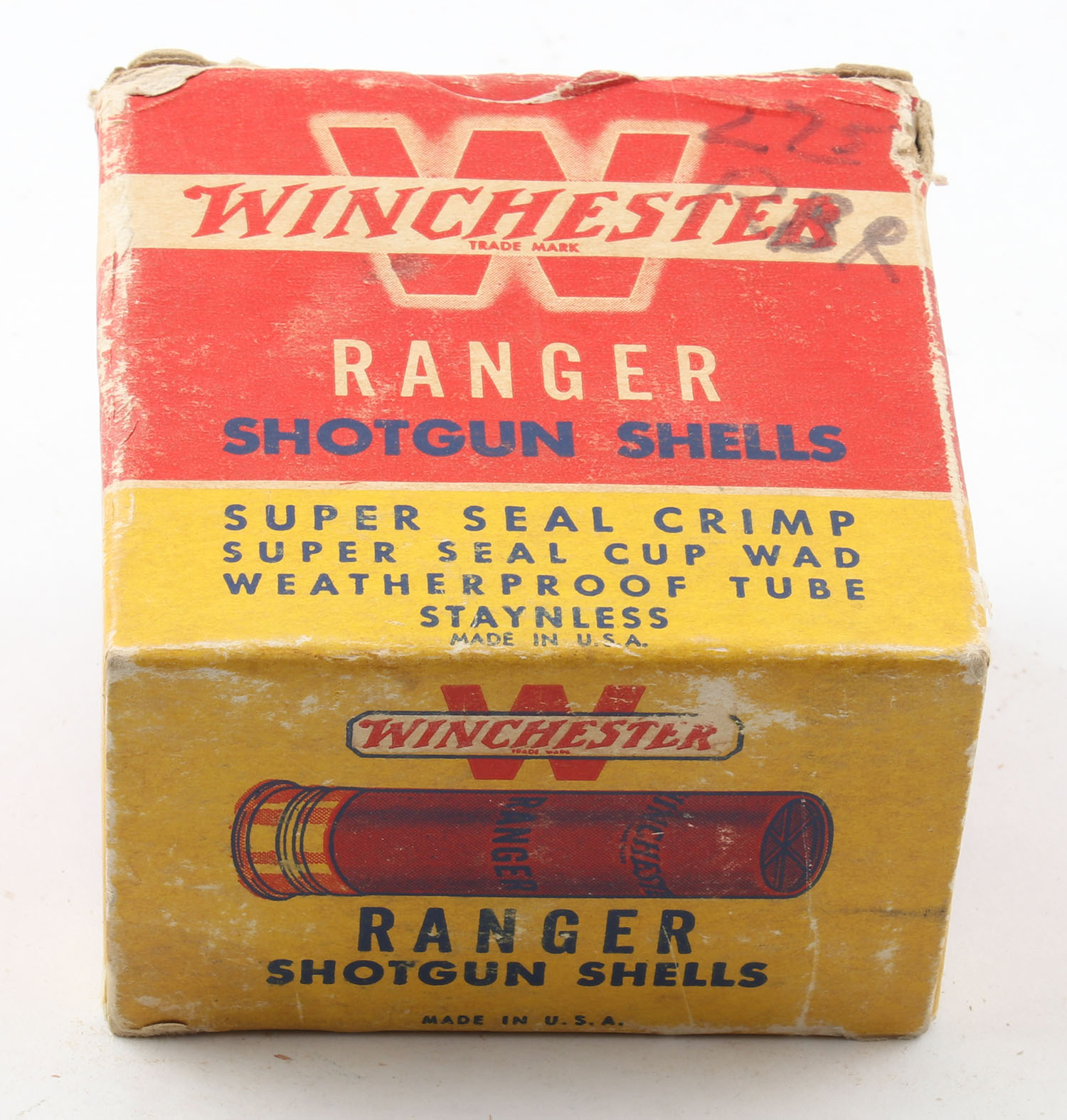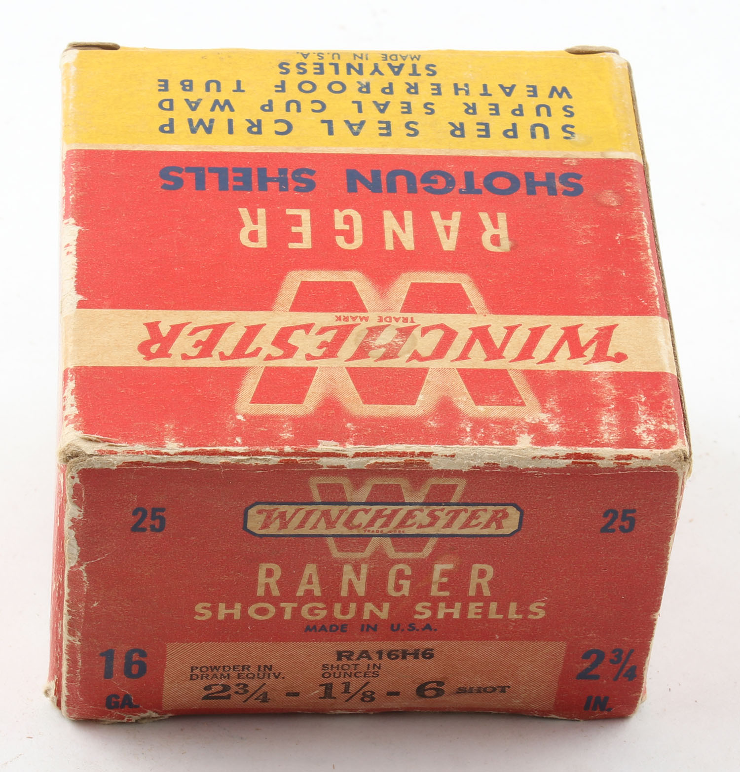 Winchester, Ranger, 16ga., 2 3/4'', 1pc., Full, shot size 6, red, white, & yellow box, box has age soiling with edge & corner wear, paper shells are excellent. Grade: Very Good - Value: 10 to 40