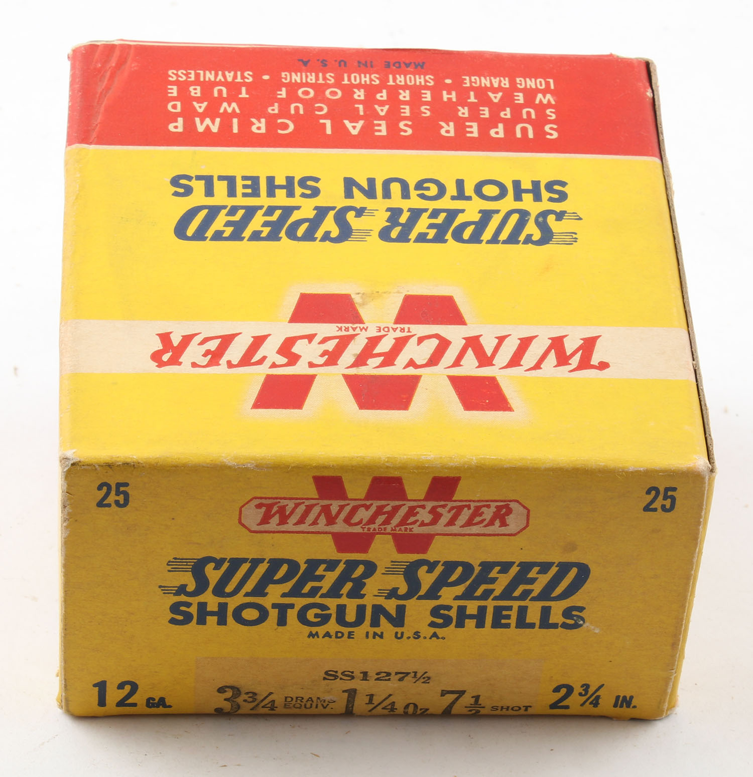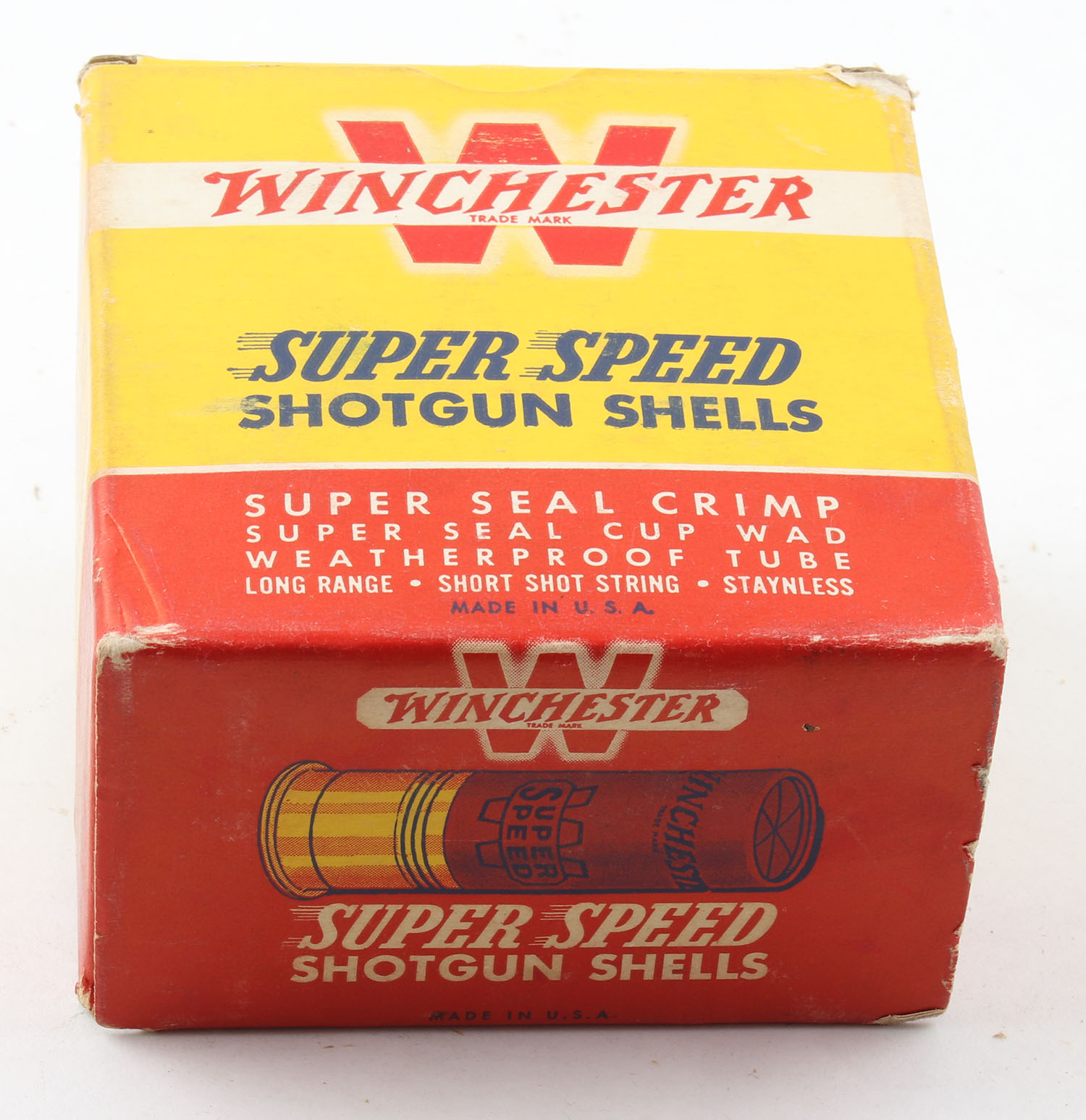 Winchester, Super Speed, 12ga., 2 3/4'', 1pc., Full, shot size 7 1/2, Red, black and yellow box, box has light scuffing, paper shells are excellent. Grade: Excellent - Value: 10 to 40