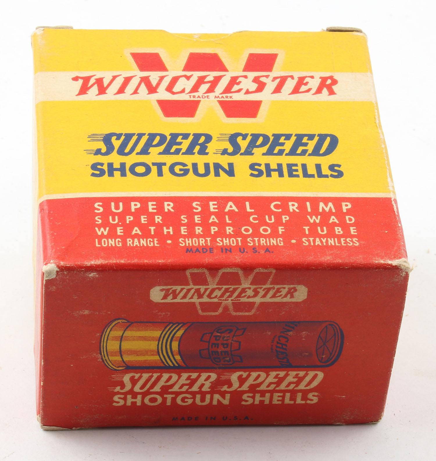 Winchester, Super Speed, 16ga., 2 3/4'', 1pc., Full, shot size 6, red, black, and yellow box, box is very solid with excellent colors, paper shells are excellent. Grade: Excellent + - Value: 10 to 40